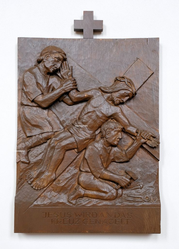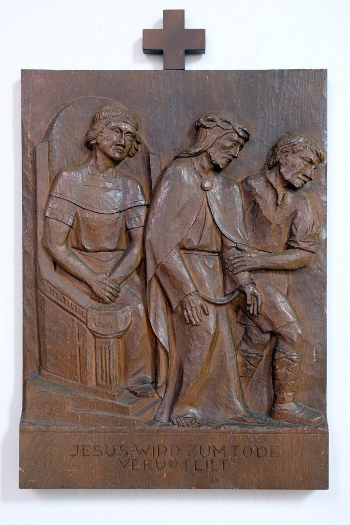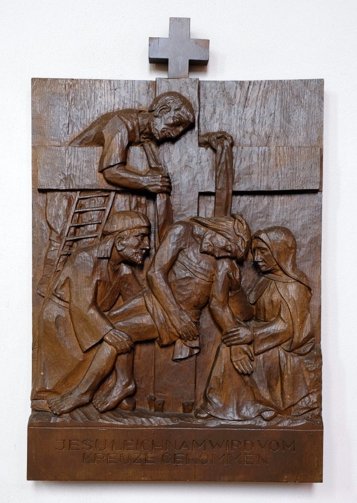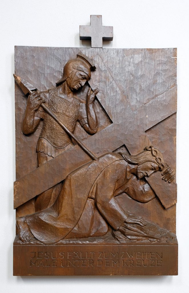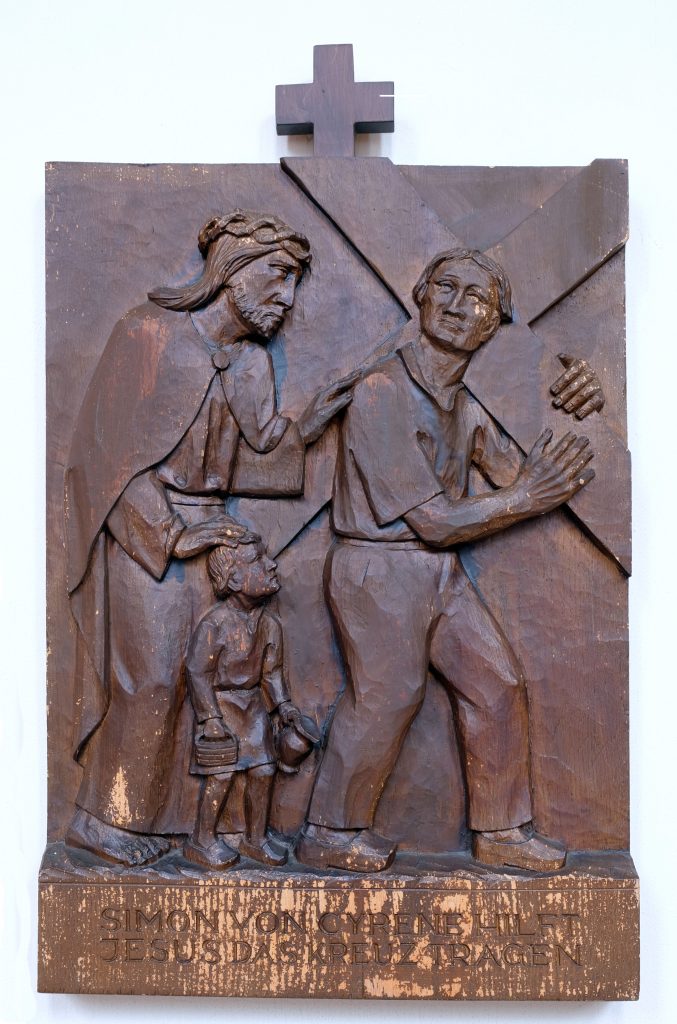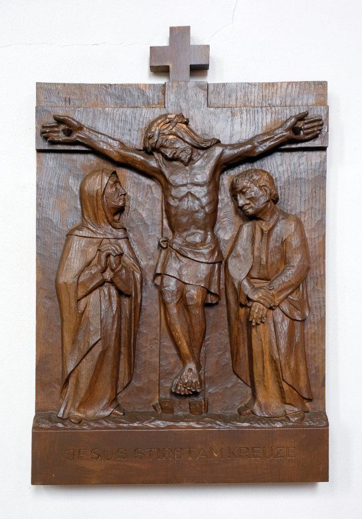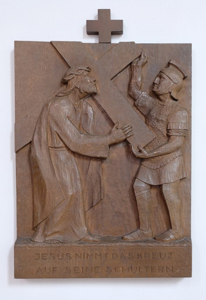 Zu beiden Seiten des Kirchenschiffes hängen gleichmäßig verteilt 14 Kreuzwegstationen. Die erste Station beginnt in Chornähe an der Westwand. Die Reliefs stammen aus der Mitte des 20. Jahrhunderts und sind mit dem Kürzel HD signiert.
