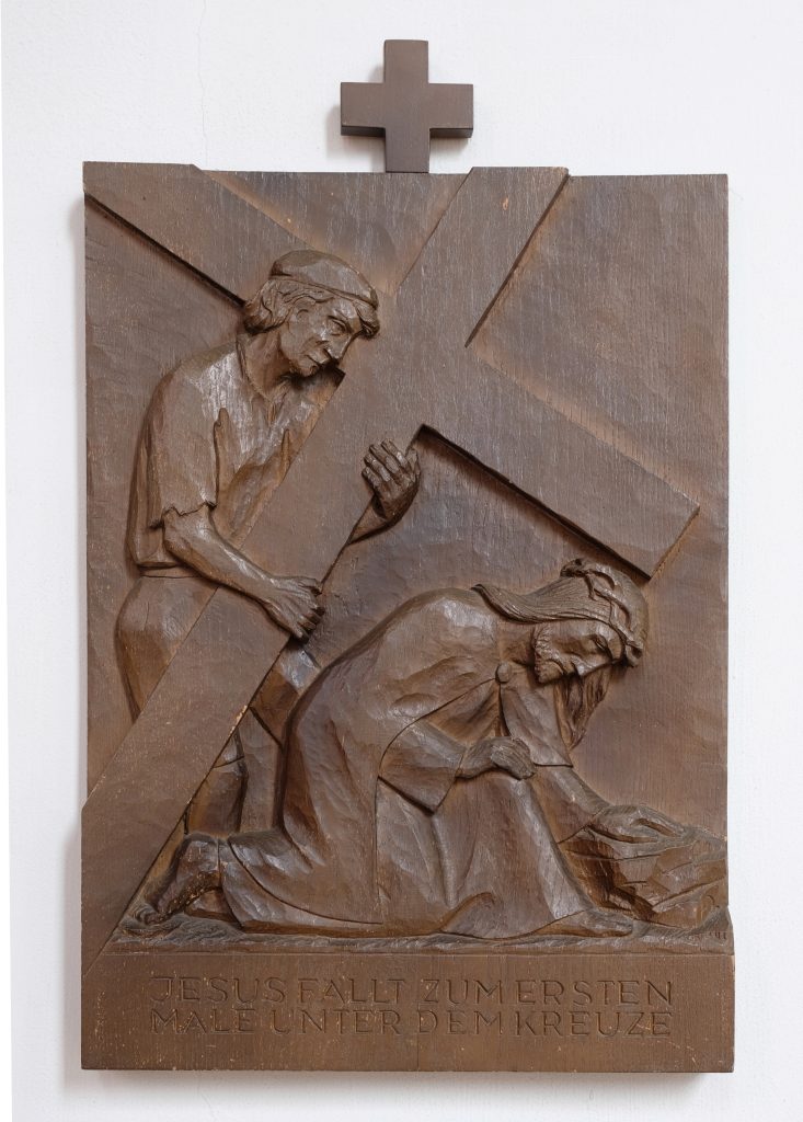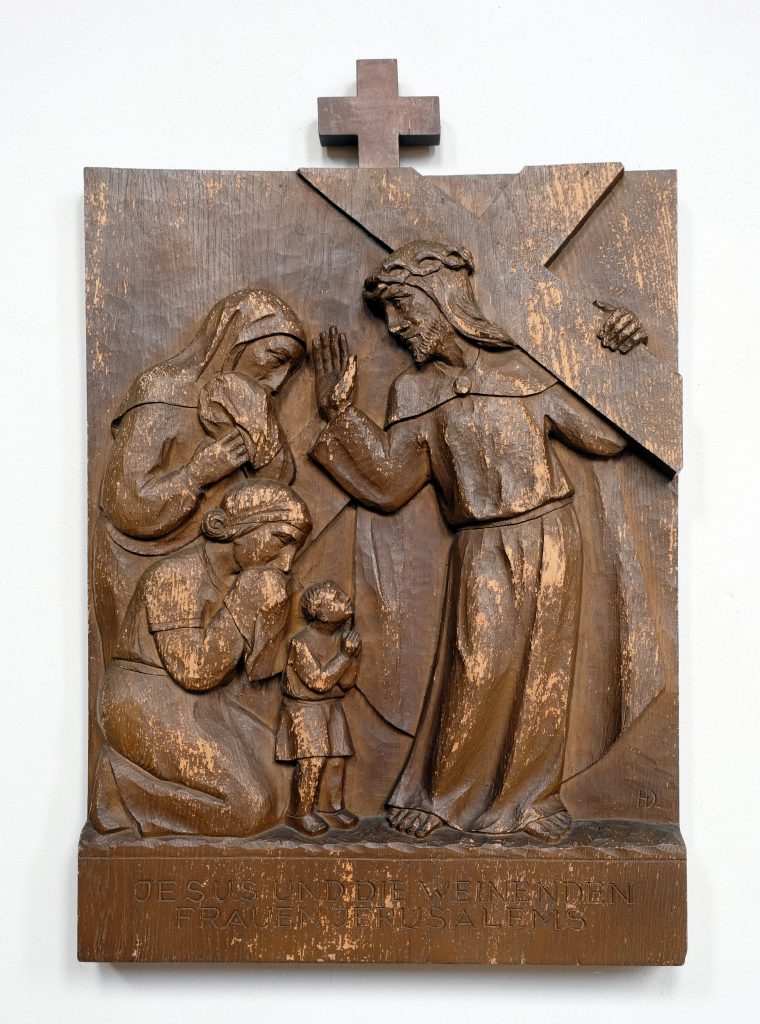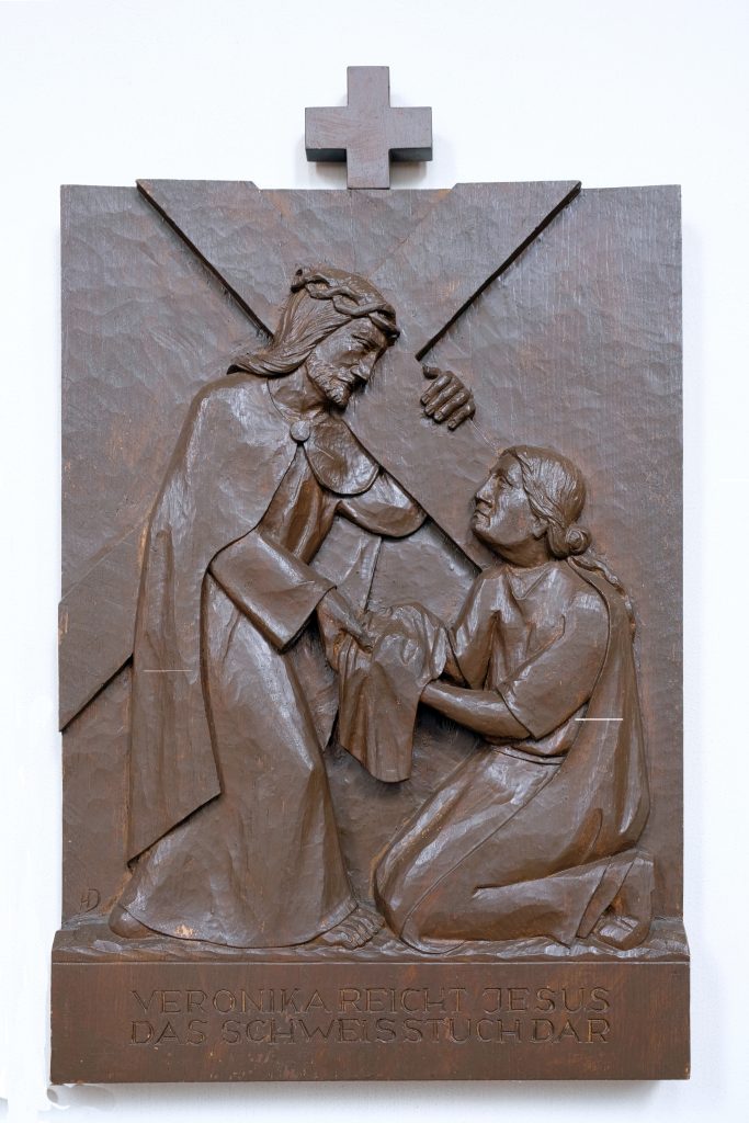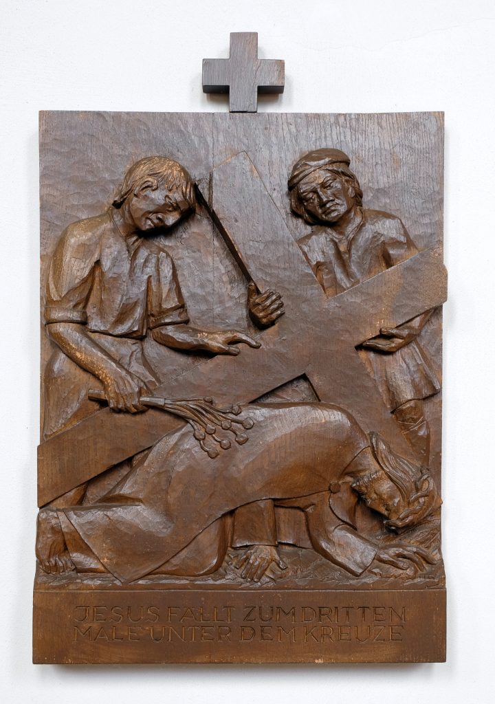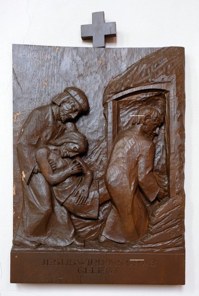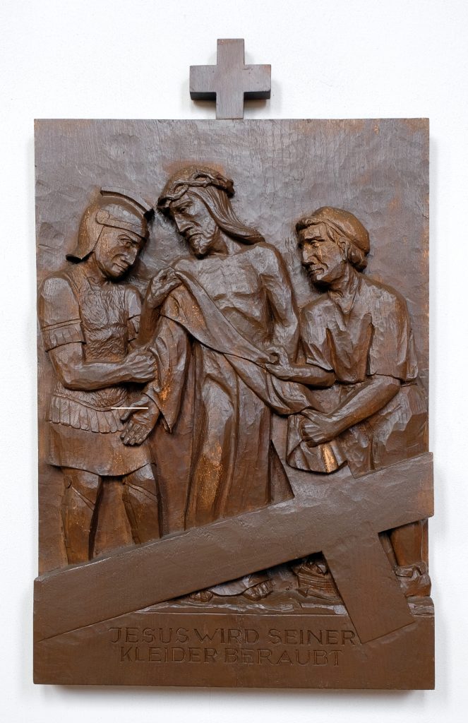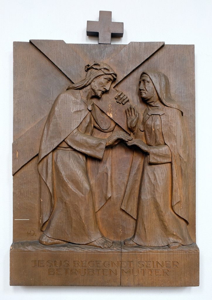 Zu beiden Seiten des Kirchenschiffes hängen gleichmäßig verteilt 14 Kreuzwegstationen. Die erste Station beginnt in Chornähe an der Westwand. Die Reliefs stammen aus der Mitte des 20. Jahrhunderts und sind mit dem Kürzel HD signiert.