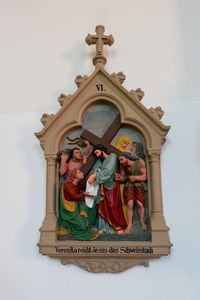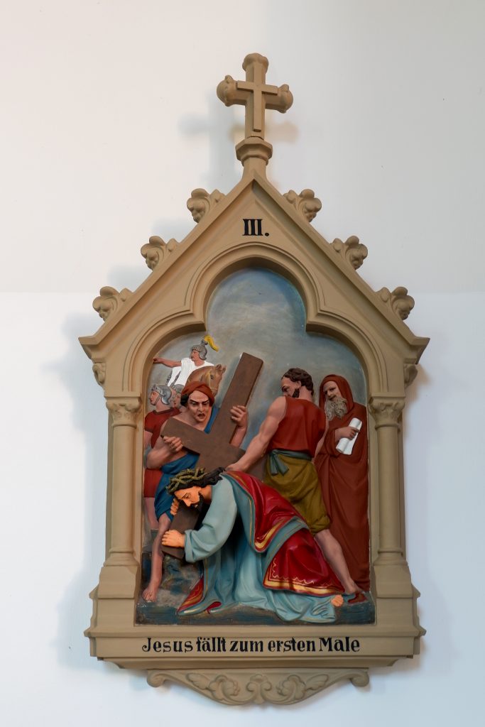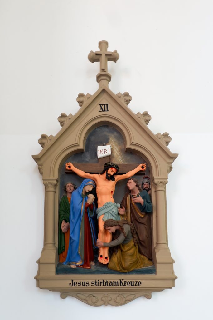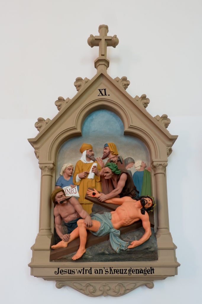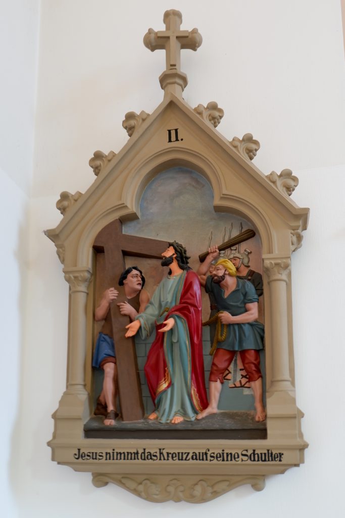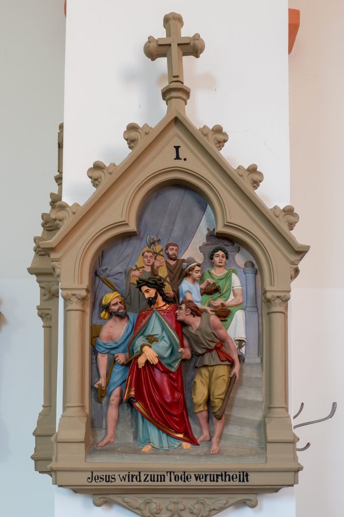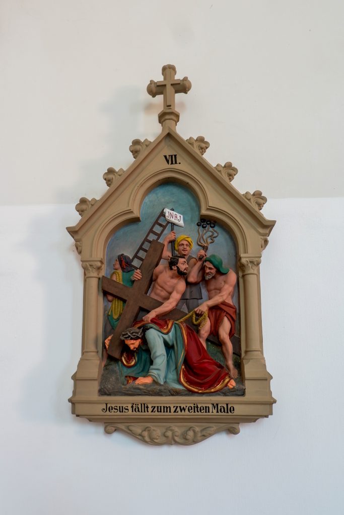 An den Kirchenraumwänden hängen 14 Kreuzwegstationen aus Terrakotta oder Gips. Reliefartig werden die Szenen des Leidenswegs Christi unter einer Kleeblattbogenstellung dargestellt.