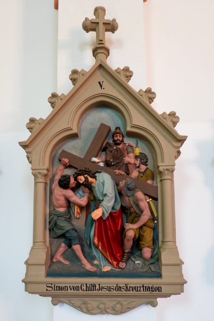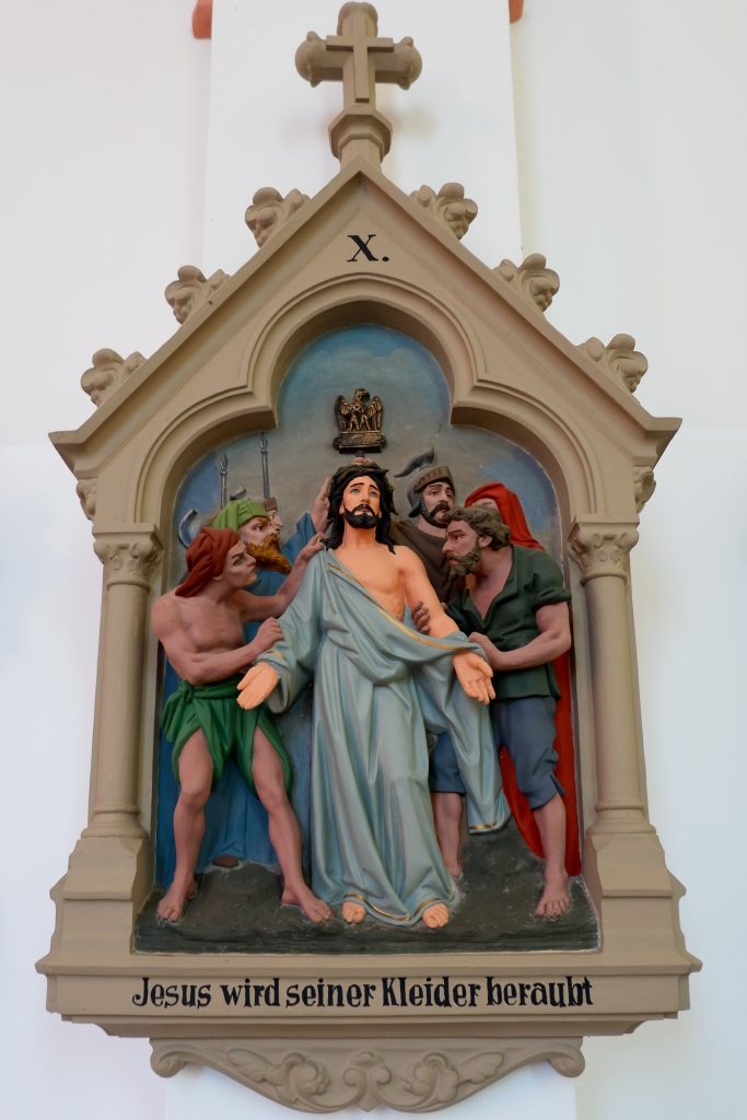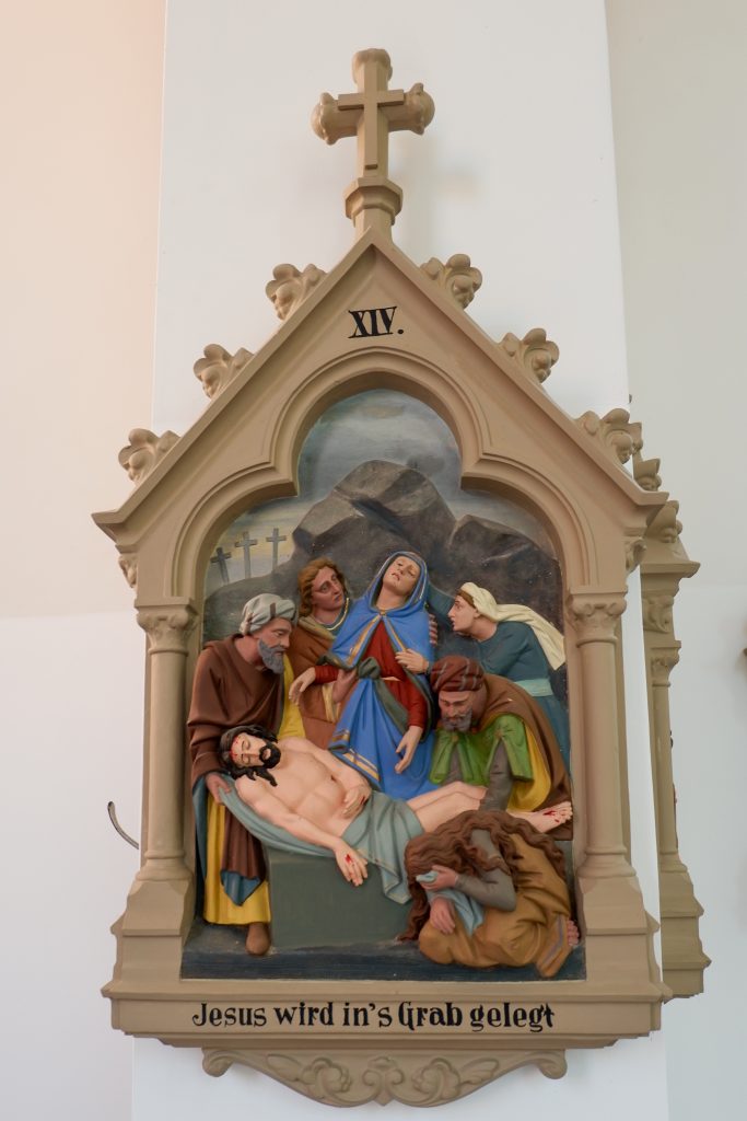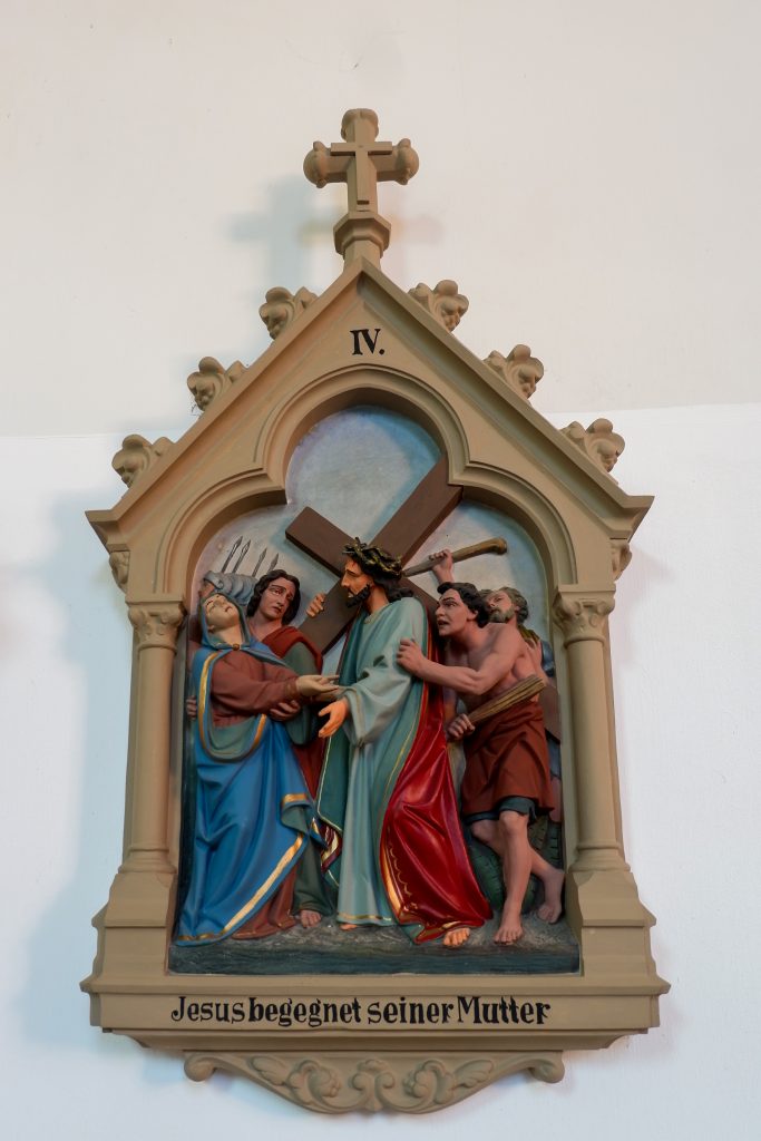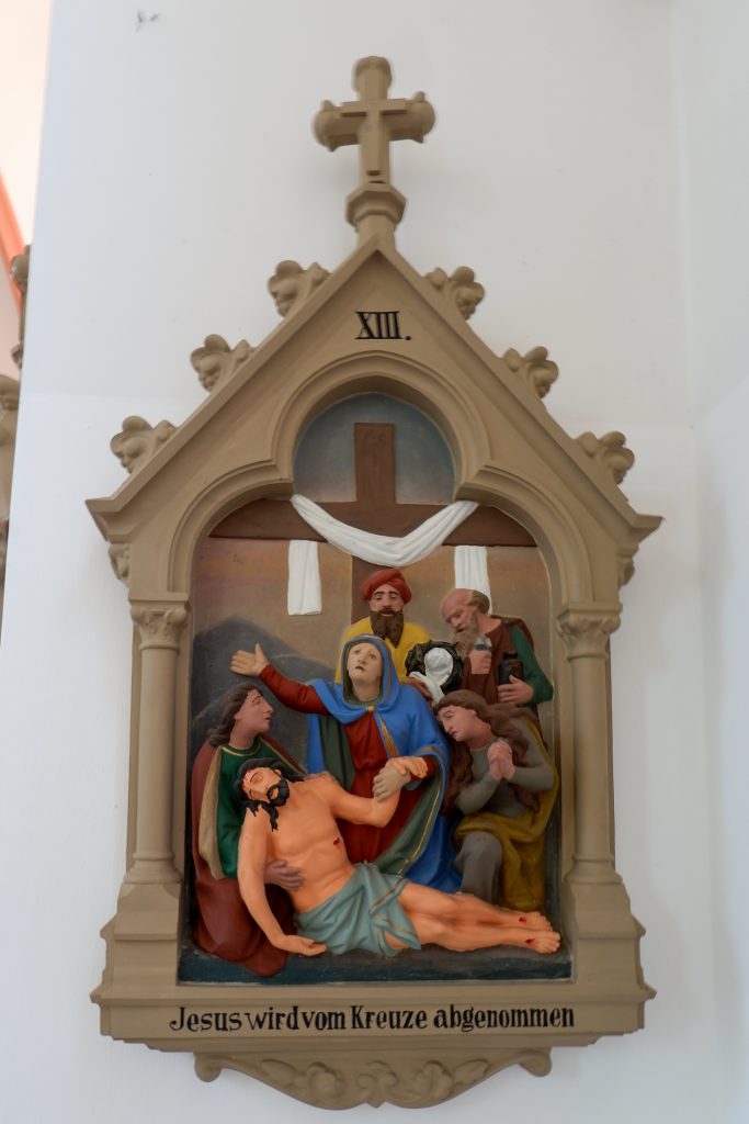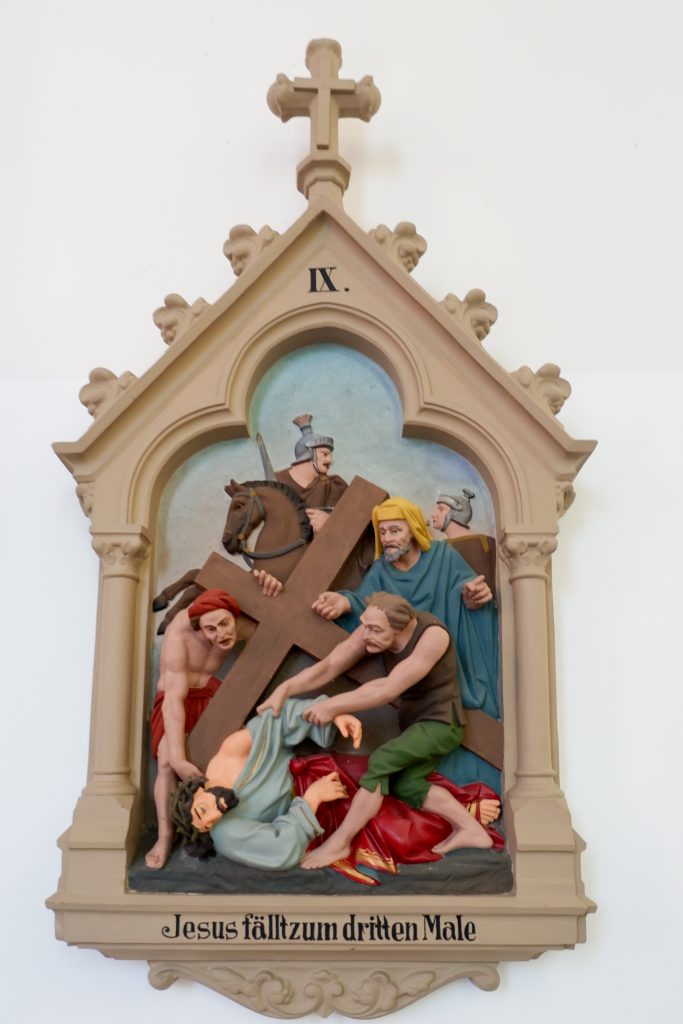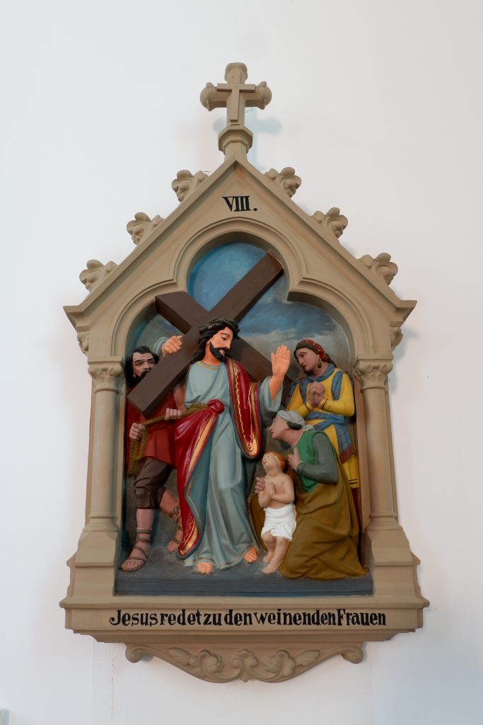An den Kirchenraumwänden hängen 14 Kreuzwegstationen aus Terrakotta oder Gips. Reliefartig werden die Szenen des Leidenswegs Christi unter einer Kleeblattbogenstellung dargestellt.