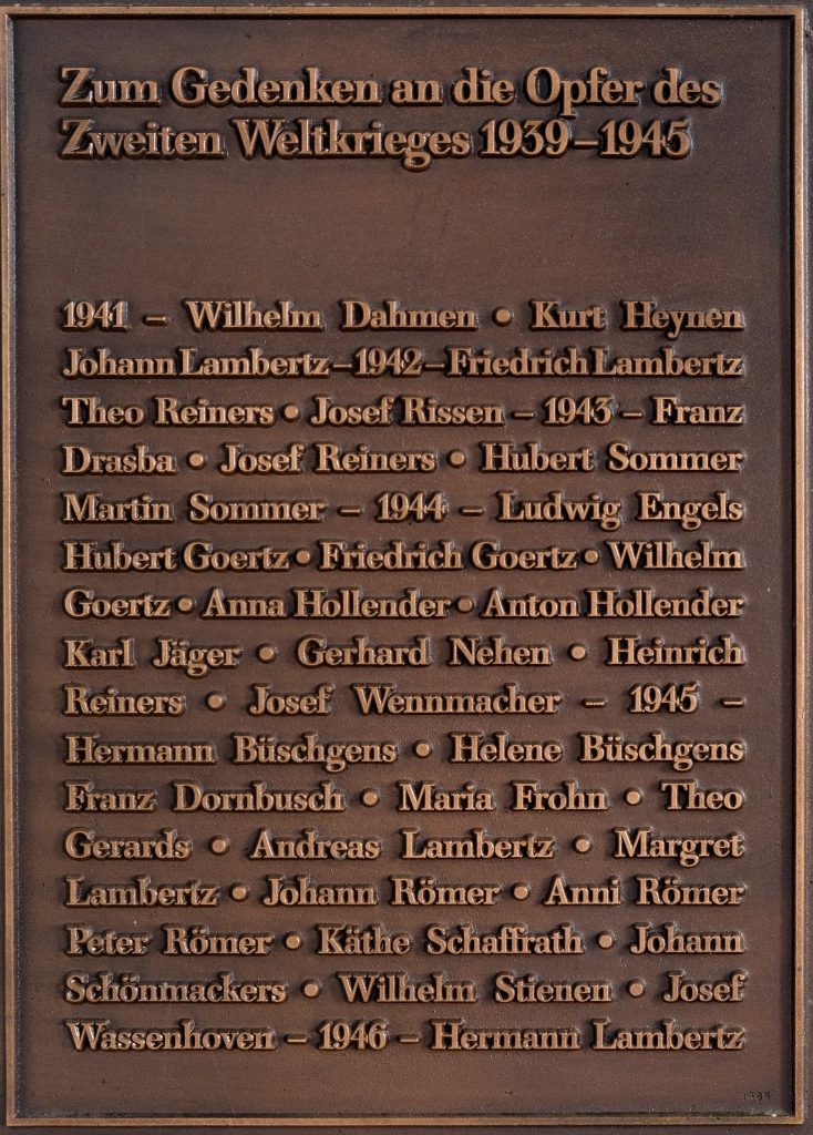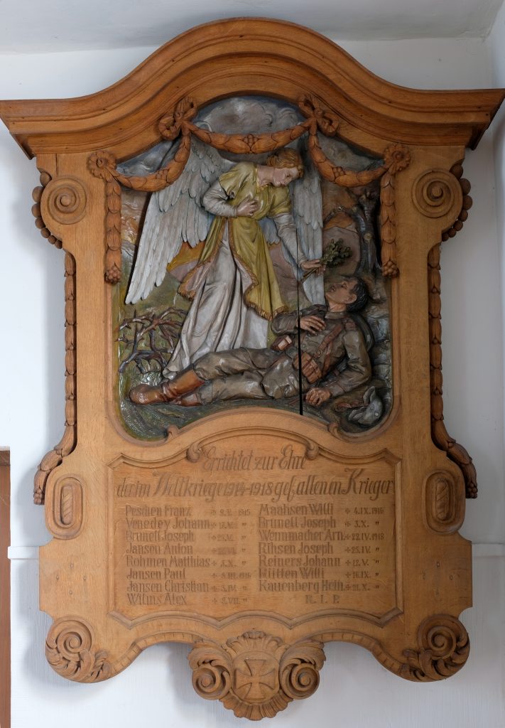Franz-Xaver Haak schuf eine Gedenktafel für die Gefallenen des 1. Weltkrieges. 15 Namen sind darauf verzeichnet. Eine Bronzetafel erinnert namentlich an die Gefallenen des 2. Weltkrieges.
