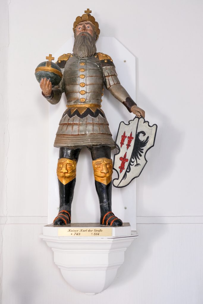 An der Wand links neben dem Altar steht Karl der Große in Ritterrüstung auf einem Sockel an der Wand. Die Figur stammt von dem Goldschmied Wolz, der sie für die Kapelle aus Lehm formte und brannte.