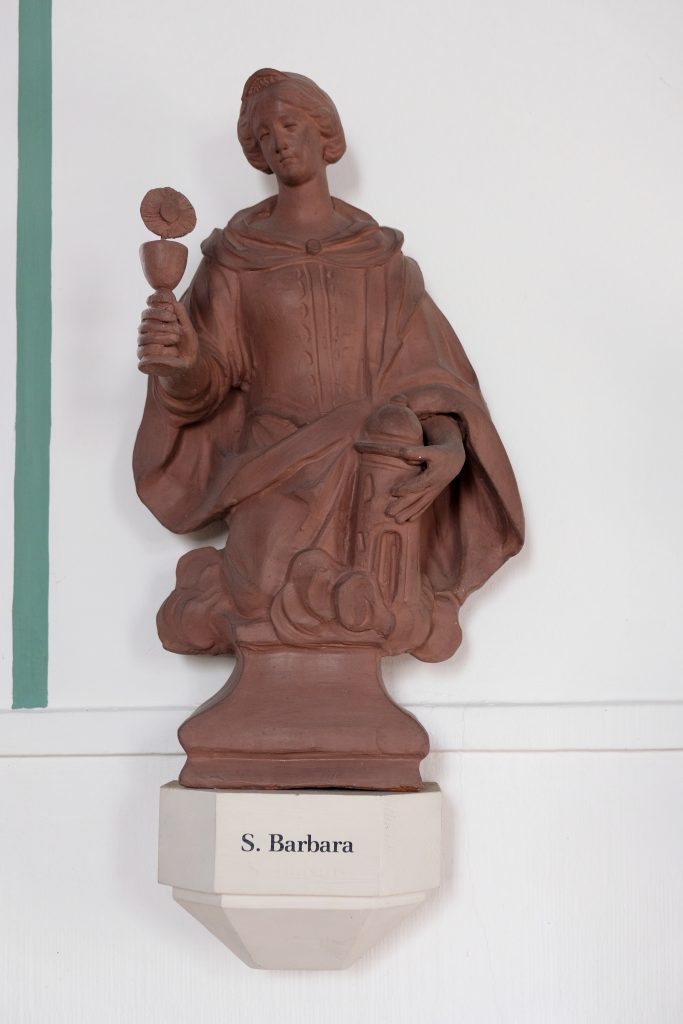 An den Seitenwänden der Kapelle hängen 14 Nothelfer aus Terrakotta. Sie stammen aus dem Spätbarock. Laut Ehrendechant Hermann Josef Kamp wurden sie aus einem Altar der Pfarrkirche Sankt Lambertus entnommen2. Friedel Krings ging davon aus, dass sie vor der Lambertuskirche in der Kapelle Sankt Leonhard standen.3 Bei der Renovierung 1983/84 wurden die Figuren von der Erkelenzer Bildhauerin Ursula Klügel wieder instand gesetzt. Folgende Heilige (in Klammern ihre Helferbedeutung) werden dargestellt: Achatius (Helfer bei Todesangst), Aegidius (Helfer bei der Beichte und den stillenden Müttern), Barbara (Patronin der Sterbenden, Helferin gegen Blitz- und Feuergefahr), Blasius (Helfer bei Halsleiden, Geschwüren, Pest, für eine gute Beichte, Beschützer des Viehs), Christoph (Helfer gegen unvorbereiteten Tod, Rettung aus jeglicher Gefahr), Cyriakus (Helfer in der Todesstunde gegen Anfechtungen), Dionysius (Helfer bei Kopfschmerzen, Tollwut, Gewissensnöten und Seelenleiden), Erasmus (Helfer bei Leibschmerzen, Krämpfen, Koliken, Unterleibsbeschwerden und bei Magenkrankheiten), Eustachius (Helfer bei schwierigen Lebenslagen und bei Trauerfällen), Georgius (Helfer bei Kriegsgefahren, Fieber, Pest und anderem, gegen Versuchung und für gutes Wetter), Katharina (Beschützerin der Mädchen, Jungfrauen und Ehefrauen, auch Helferin bei Leiden der Zunge und Sprachschwierigkeiten), Margaretha (Patronin der Gebärenden und bei allen Wunden), Pantaleon (Patron der Ärzte und Hebammen) und Vitus (Helfer bei Krämpfen, Epilepsie, Tollwut, Veitstanz (Chorea Huntington), Bettnässen und Schlangenbiss).4