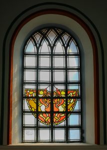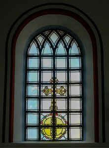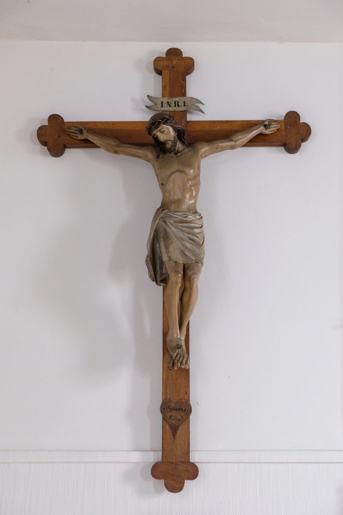 Rechts neben der Eingangstür hängt ein Missionskreuz aus Holz. Es ist den spätgotischen Hochkreuzen nachempfunden. Die Enden der Kreuzbalken enthalten Kleeblätter. Der Korpus ist mit einem Lendenschurz bekleidet und der Kopf der Christusfigur neigt sich nach rechts. In einem Herz aus Holz am unteren Ende des Balkens steht der Begriff „Missionskreuz“.