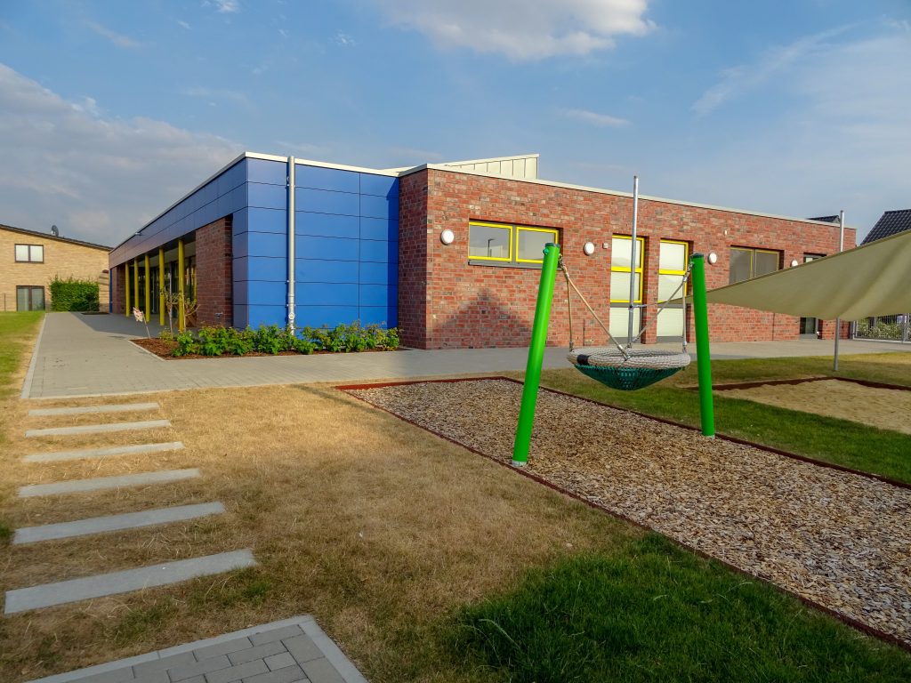 Die neue eingeschossige Kindertagesstätte besteht aus einem Flachdachbau. Nur der Teil südlich des Eingangs besitzt ein flaches Satteldach. Die Gruppenräume sind zu einer selbstständigen Einheit zusammengefasst. Die Fassade besteht teilweise aus roten Ziegelsteinen, im Bereich zum Spielgelände hin aus blauem Beton und großen Fensterflächen. Hier wird das Dach durch gelbe Säulen gehalten.