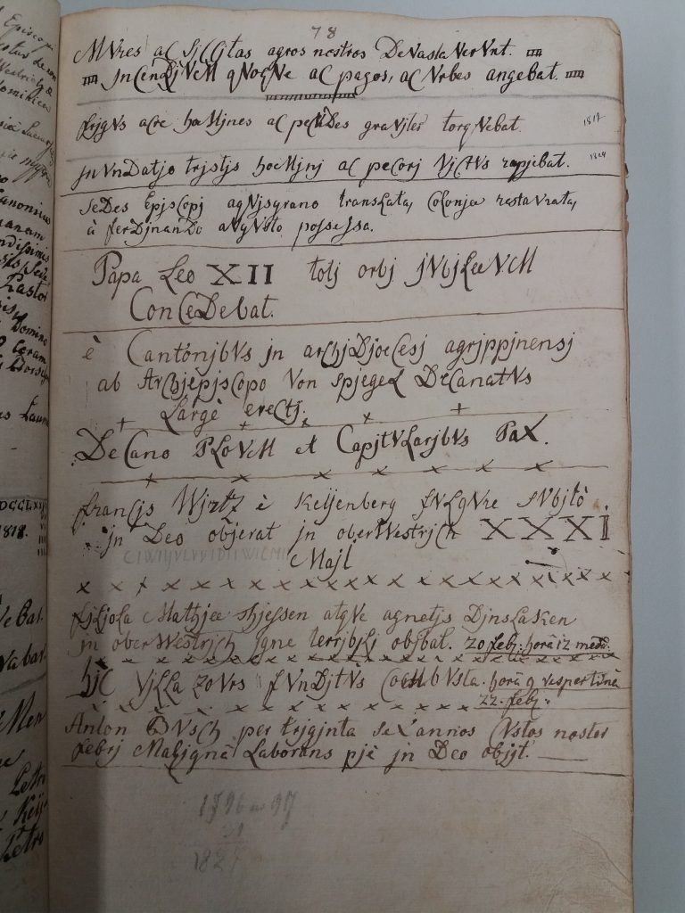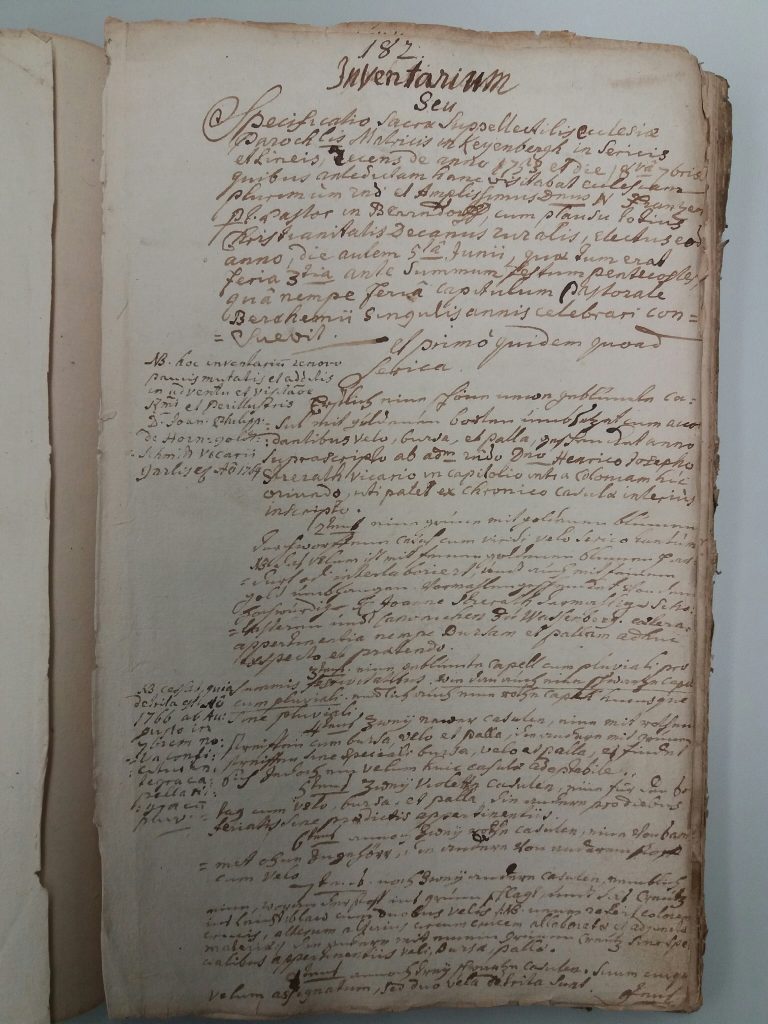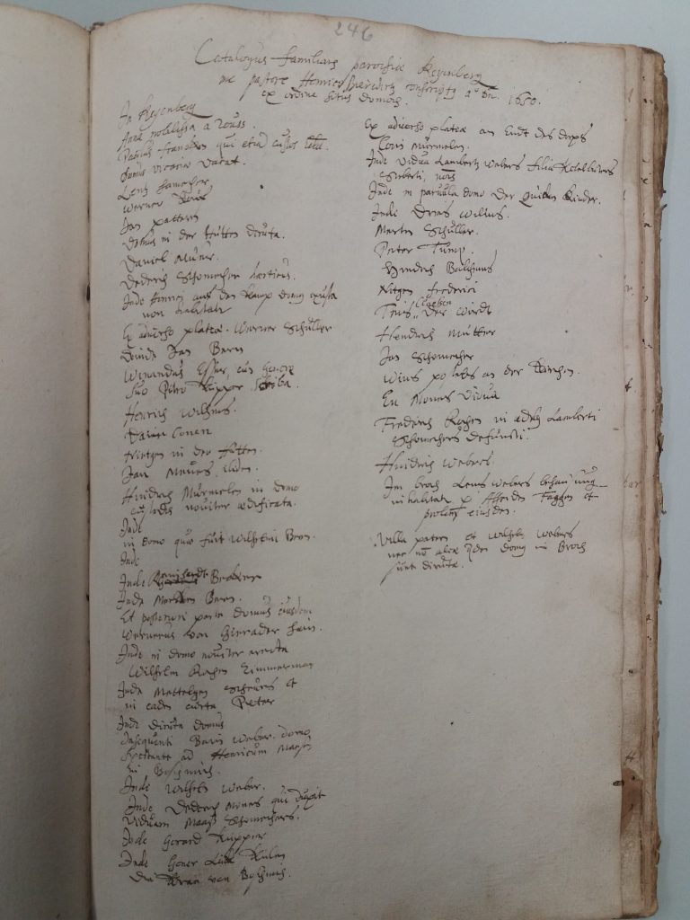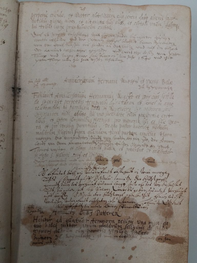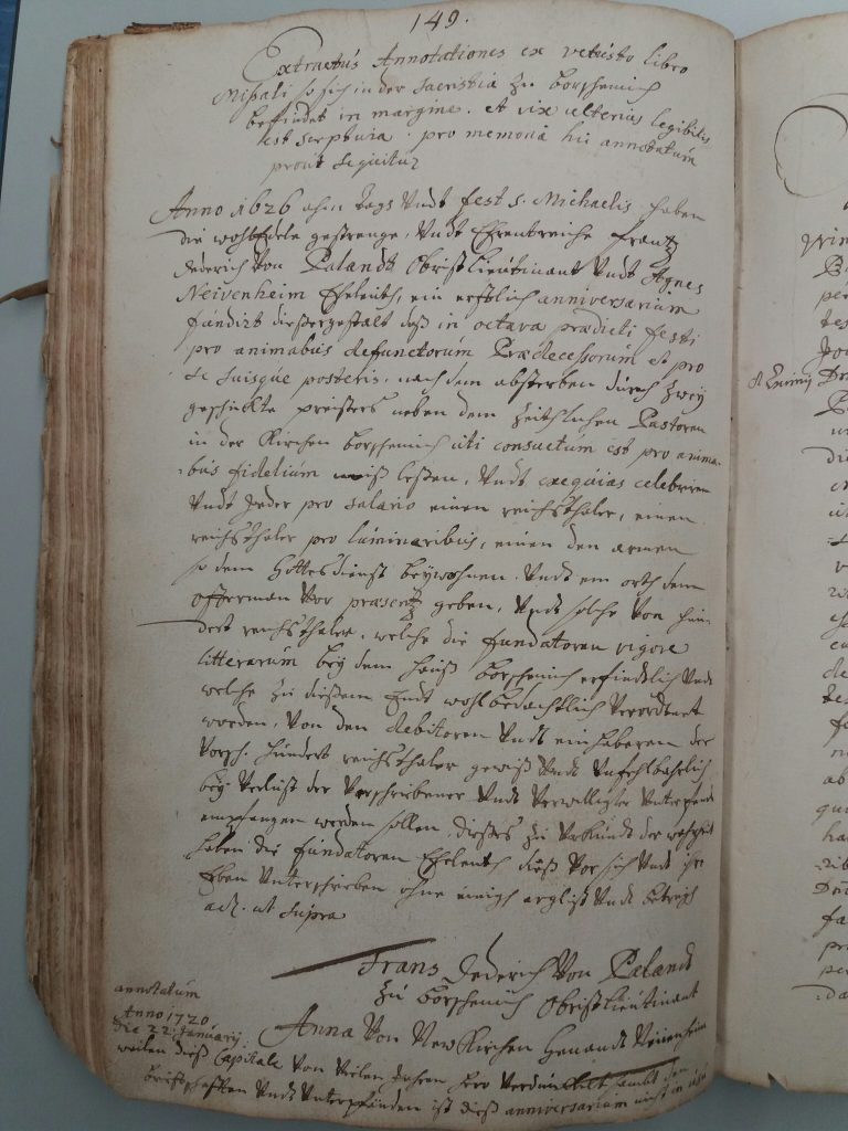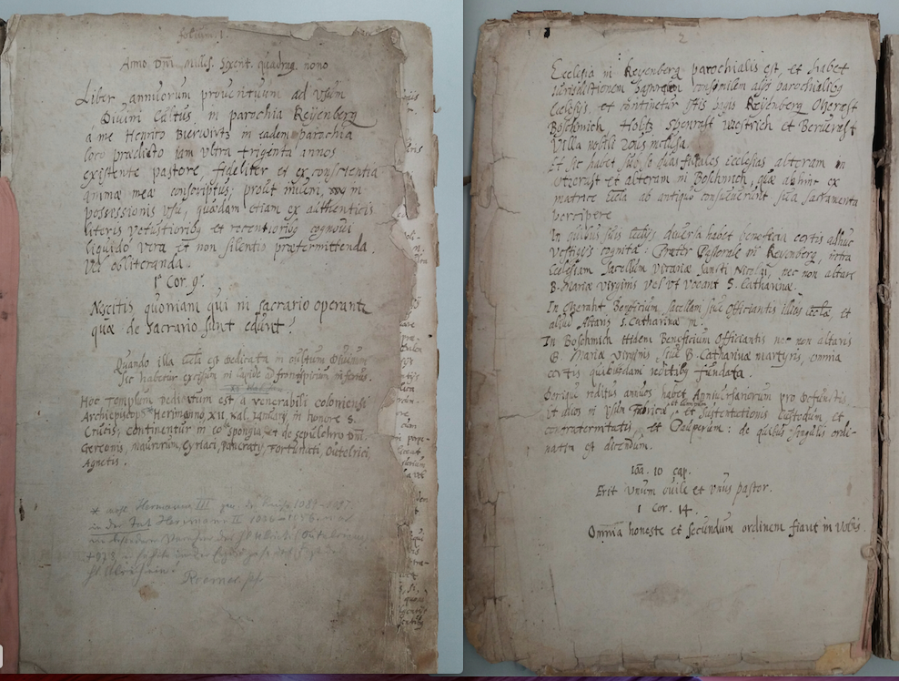 Während des Dreißigjährigen Krieges (1618 -1648) und noch ein Jahrzehnt darüber hinaus bis zum Tode im Jahre 1658 war Pfarrer an der Kreuzerhöhungskirche in Keyenberg der aus Grevenbroich stammende und als junger Mann in den Jesuitenorden eingetretene Heinrich Bierwirtz. 1649 entschloss er sich, das heute noch im Bischöflichen Diözesanarchiv Aachen, Depositum Pfarrarchiv Keyenberg Heilig Geist A 373, vorhandene sogenannte „Lagerbuch“ anzulegen, dem er den Titel gab „Liber annuorum proventuum 1649“ (Buch der jährlichen Einkünfte 1649).