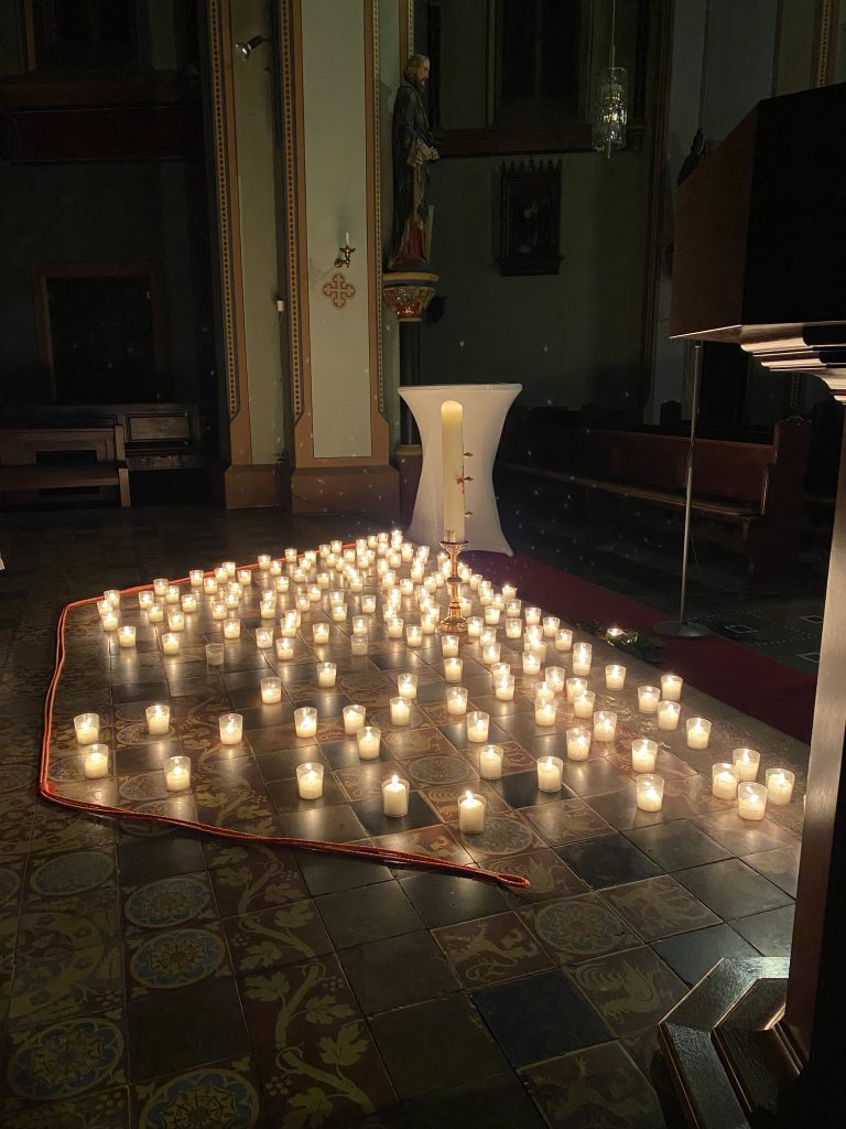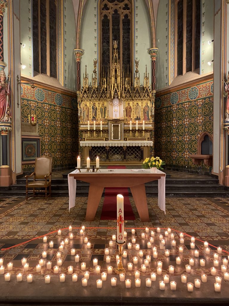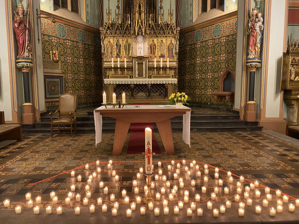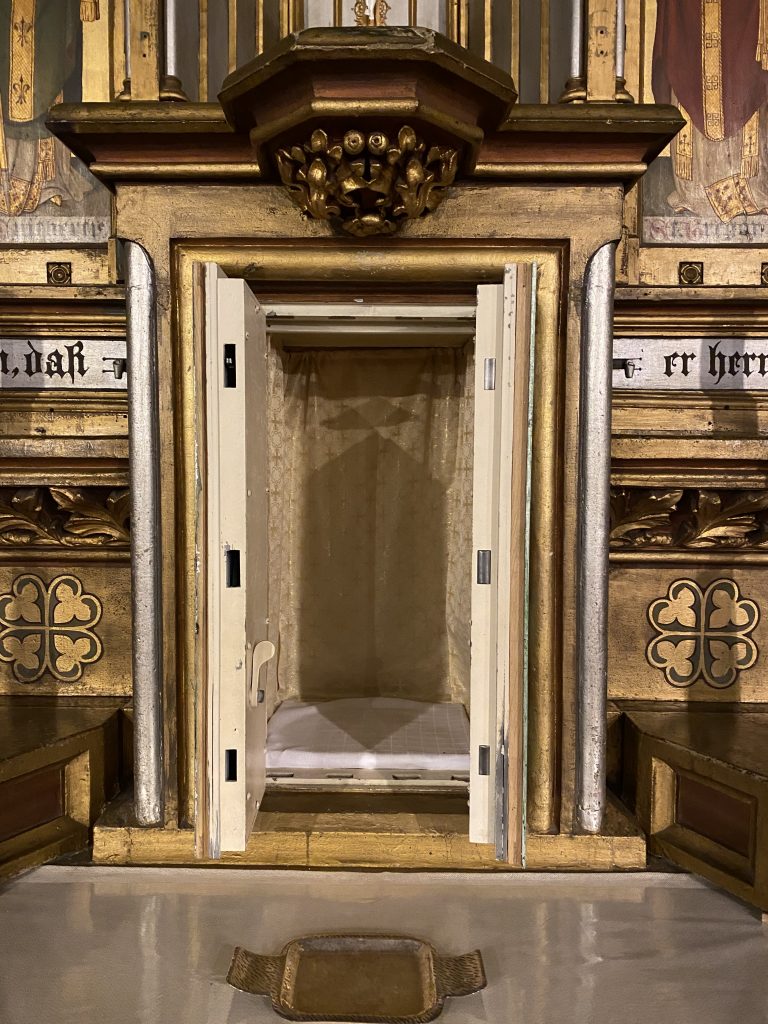 Der Boden im Chorbereich und vor den beiden Seitenaltären wurde mit Mettlacher Kirchenfliesen belegt.