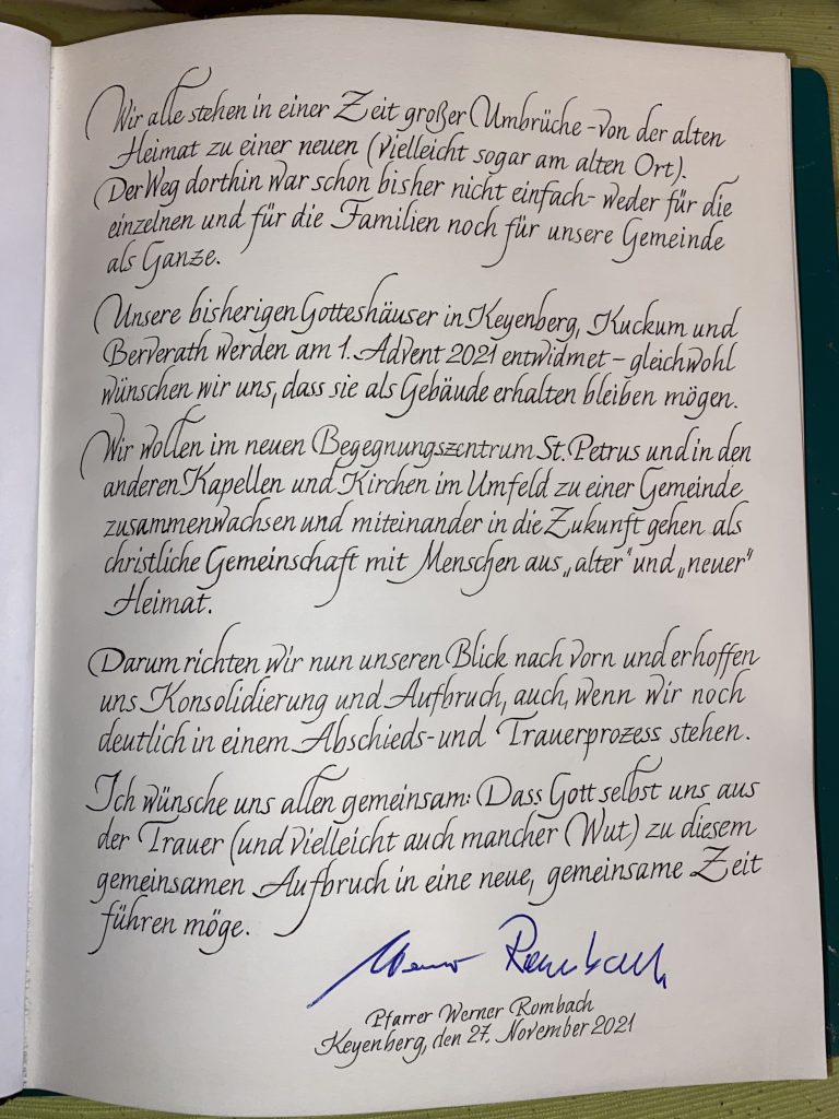 Wegen der Coronapandemie und wegen der unsicheren Lage bezüglich der zukünftigen Ausdehnung des Tagebaues Garzweiler II wurde der Entwidmungstermin für die Heilig Kreuz Kirche vom Aachener Bischof Helmut Dieser vertagt. Er setzte ihn schließlich auf den Sonntag, den 28. November 2021. Die Entwidmung sollte in aller Stille geschehen. Am Samstag zuvor konnten die Keyenberger Bürger sich von ihrer Kirche verabschieden und sich dabei in ein Abschiedsbuch eintragen. Viele Bürger bedauerten, dass es keine Verabschiedung in großem Rahmen wie etwa in Borschemich und Immerath gab. Das habe die Kirche doch eigentlich verdient, meinten viele. Leider wurde die Verabschiedung dann auch noch durch Proteste der Braunkohle- und Abbaugegner gestört, die die Türschlösser verklebten und bis Mitternacht in der Kirche ihren Protest zeigten.