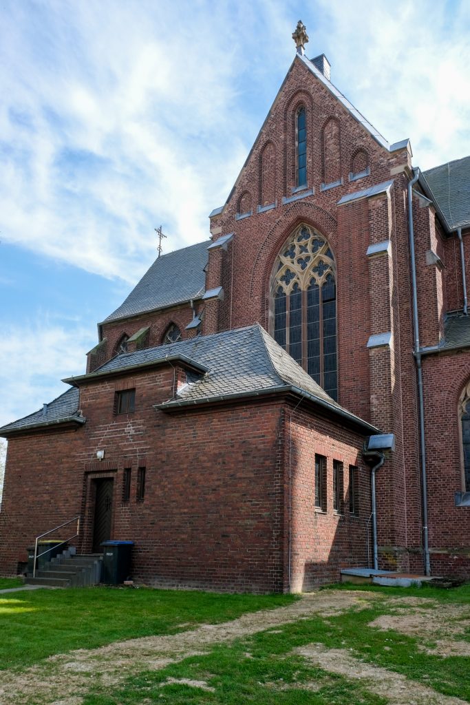 Das Kirchengebäude besteht aus einer dreischiffige Backsteinbasilika, einem Querhaus, einem Chor und einem 57 m hohen Backsteinturm. Die Grundfläche des Gebäudes beträgt 43,50 m x 17,12 m. Im Innern enthält die Kirche ein Kreuzrippengewölbe, vier Joche im Langhaus, ein quadratisches Vierungsjoch und zwei Rechteckjoche im Nebenschiff, die die gleiche Gewölbescheitelhöhe wie Mittelschiff und Chor haben. Der Chor besteht aus zwei Jochen und einer fünfseitiger Apsis mit einer spitzbogigen Arkadenöffnung zu den polygonalen Nebenchören, sowie spitzbogige Arkaden zwischen Haupt- und Nebenschiffen. Der Westturm ist dem Mittelschiff vorgebaut und enthält vier Geschosse, dessen Strebepfeiler im vierten Geschoss in vier Rundtürmchen übergehen.9