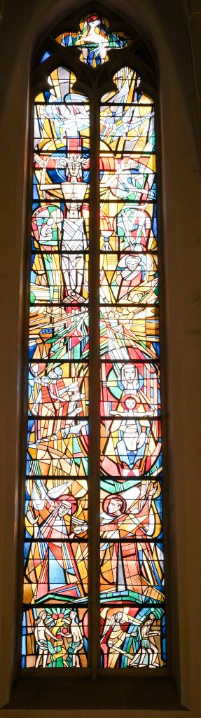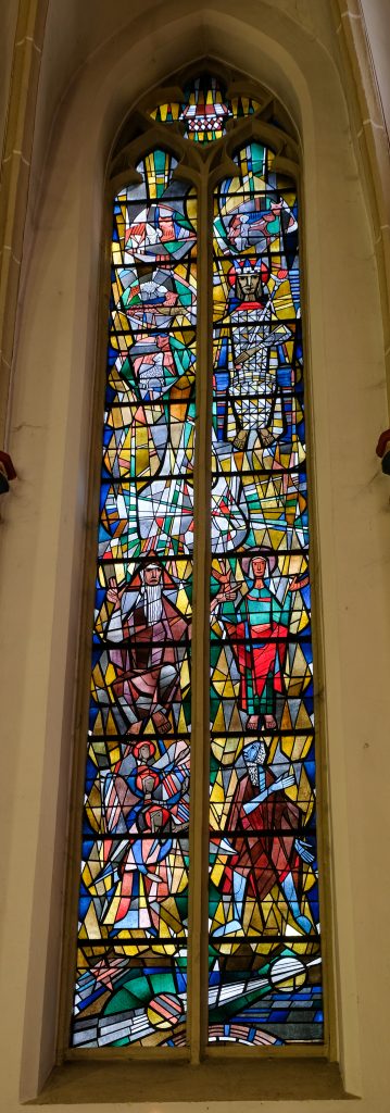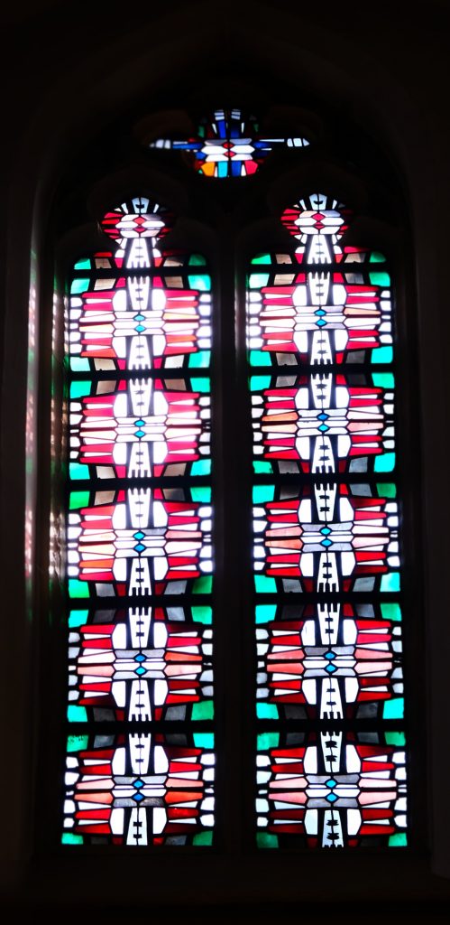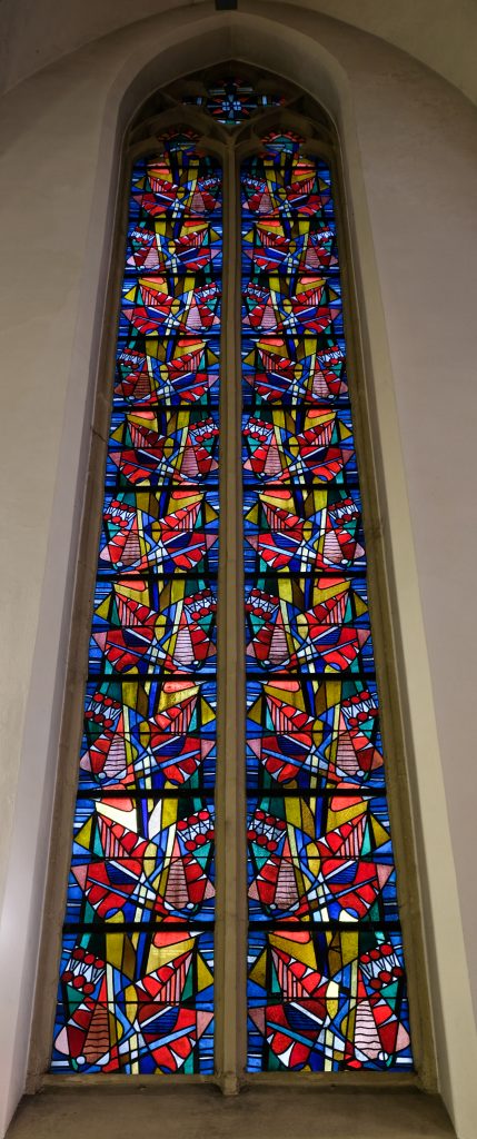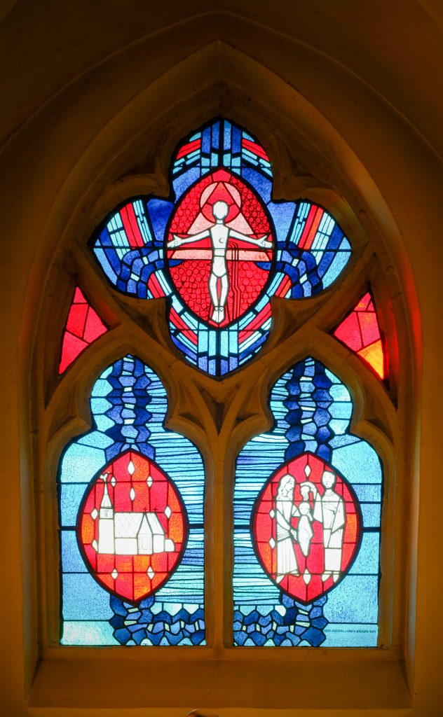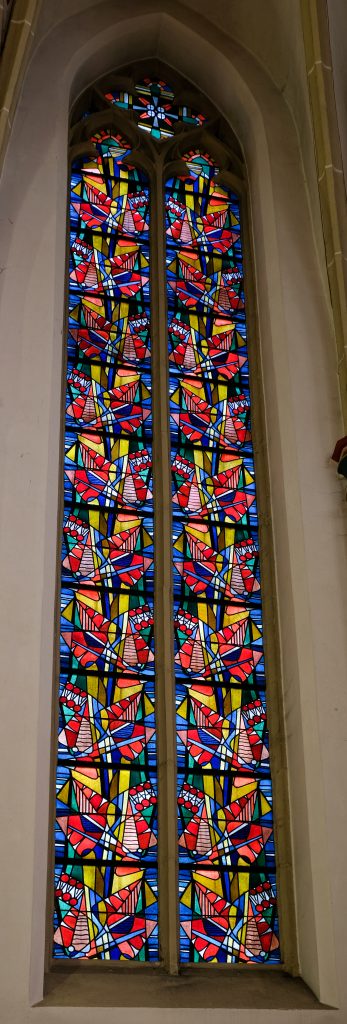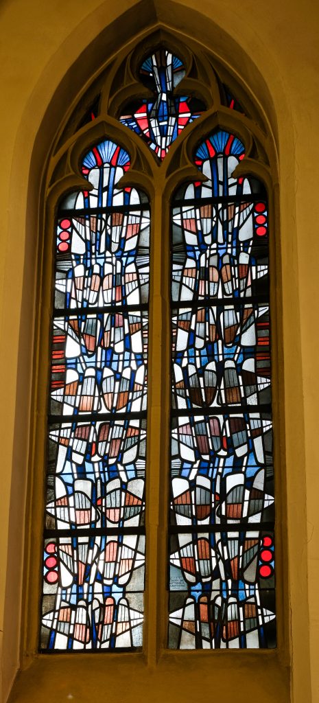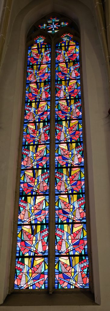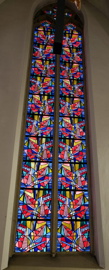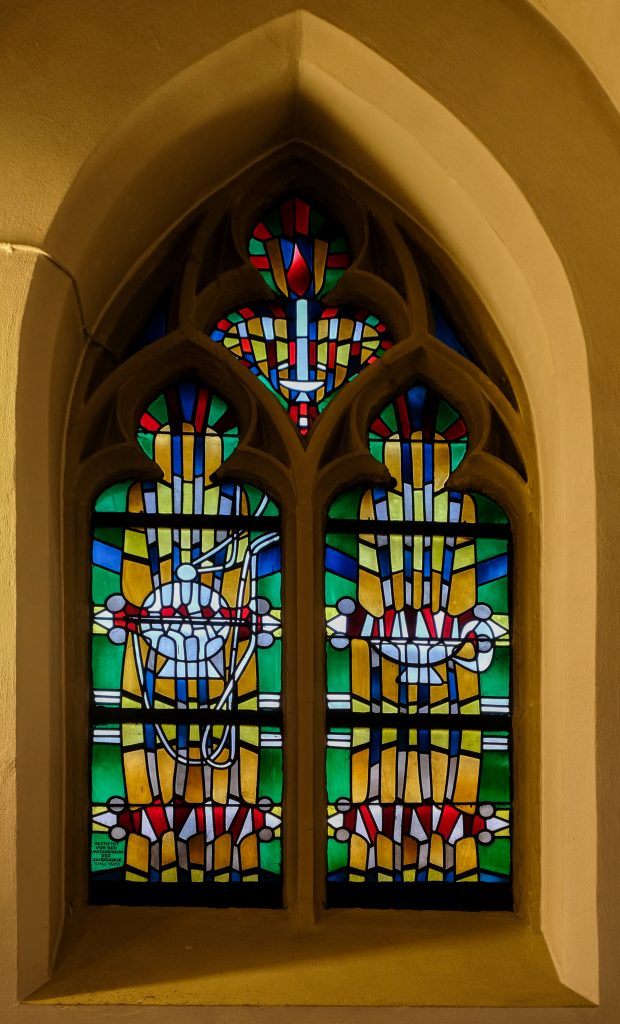 Sie entstanden 1961. Seitlich befinden sich noch je zwei gleiche Ornamentfenster.