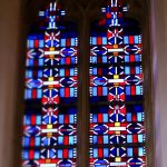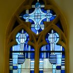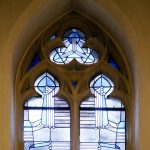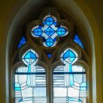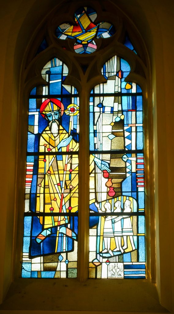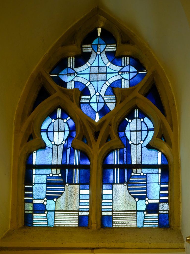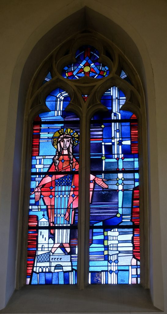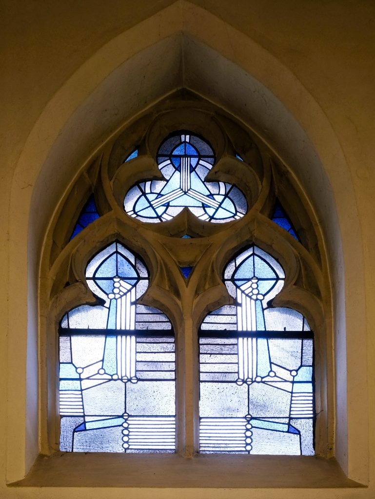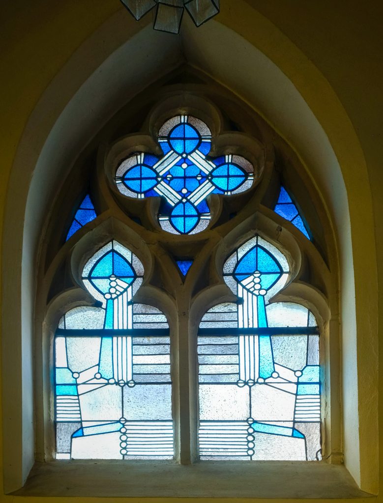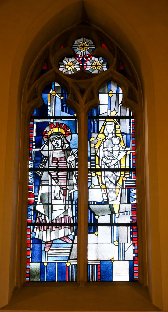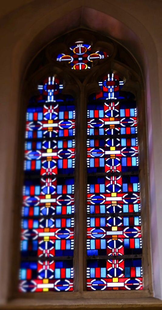 Sie entstanden 1961. Seitlich befinden sich noch je zwei gleiche Ornamentfenster.