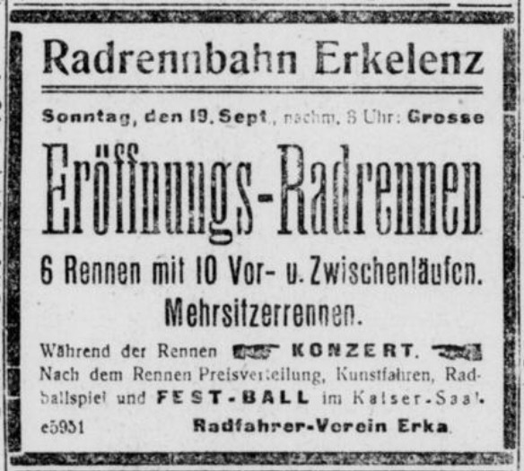 Die Radrennbahn in Erkelenz wurde am Sonntag, dem 29. April 1923, eröffnet.