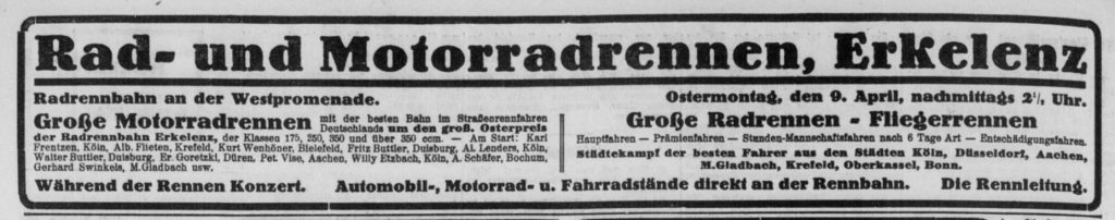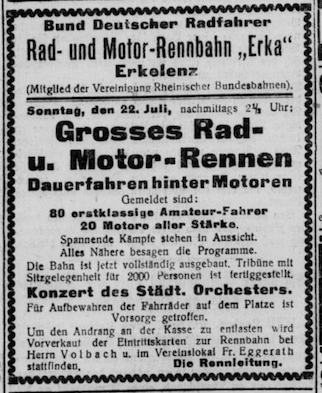 Im Rheinland gilt der Radsport neben dem Boxen als die vielleicht bedeutendste und beliebteste Sportart überhaupt. Die Gründungsjahre zahlreicher, teils heute noch bestehender Radsportvereine, liegen häufig in diesen Jahrzehnten (z. B. RV Viktoria-Erkelenz-Hoven e. V. gegr. 1921).