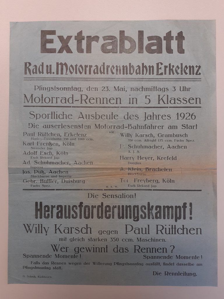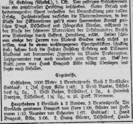 Die Zeitungsanzeige vom 2. Oktober 1923 berichtet, dass bei dem Rennen auch Motorräder mit Hilfsmotoren von der Firma Fuchs & Co. in Erkelenz mitfuhren. So erreichte den 2. Platz mit Fuchs Jüngerkes aus Viersen und den 3. Platz mit Fuchs Heinrichs aus Baal. Bei den schweren Maschinen belegte Willi Karsch aus Grambusch den 2. Platz.