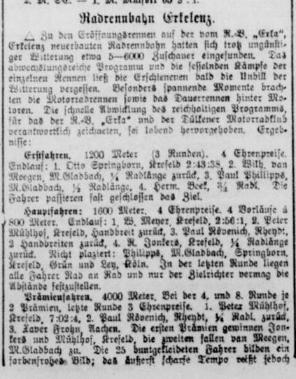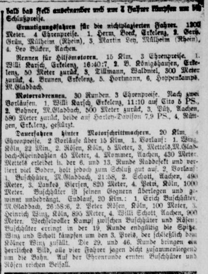Laut Artikel der Westdeutschen Landeszeitung vom 30. April 1923 hatten sich trotz ungünstiger Witterung etwa 5-6000 Zuschauer eingefunden. Das abwechslungsreiche Programm und die fesselnden Kämpfe der einzelnen Rennen ließ die Erschienenen bald die Unbill der Witterung vergessen. Die Radrennfahrer fuhren 600, 1200 und 4000 Meter. Bei dem 15 km Rennen für Hilfsmotoren erreichte Willi Karsch aus Grambusch den ersten Platz. Beim Motorradrennen über 30 Runden erreichte er ebenfalls den ersten Platz, Paul Rüttchen stürzte mit seiner Harley-Davidson, wurde aber trotzdem Vierter. Spannend war das 20 km Dauerfahren hinter Motorschrittmachern. (Radrennfahrer fahren im Windschatten hinter Motorradfahrern, sogenannten Schrittmachern, die auf einem Spezialmotorrad, dem Steher, vorausfahren und dessen Fahrer durch aufrechte Körperhaltung den Luftwiderstand für den Radrennfahrer verringert).