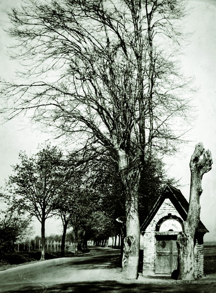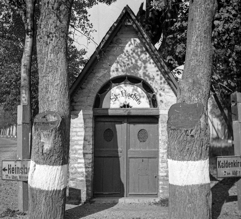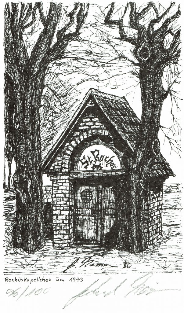 Bereits im Jahre 1772 wurde, allerdings nicht wie heute vor, sondern unmittelbar hinter der Gabelung der beiden Straßen, ein Kapellchen erbaut und dem Heiligen Rochus gewidmet. Der Heilige Rochus ist der Schutzpatron gegen Pest, Cholera und anderen Seuchen. Die Kapelle, in der der Schutzpatron als Holzstatue stand, sollte an ein Siechen- und Leprosenhaus an gleicher Stelle erinnern. Das Rochuskapellchen war bis zu seinem Abriss von hohen Lindenbäumen umgeben.