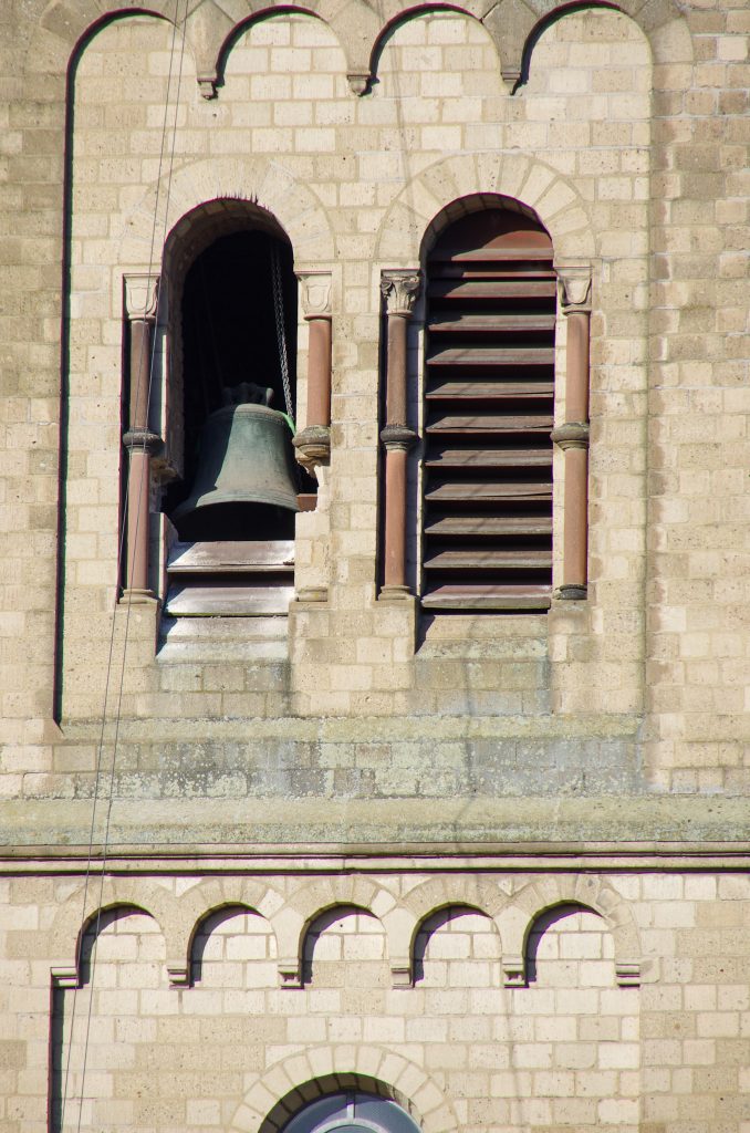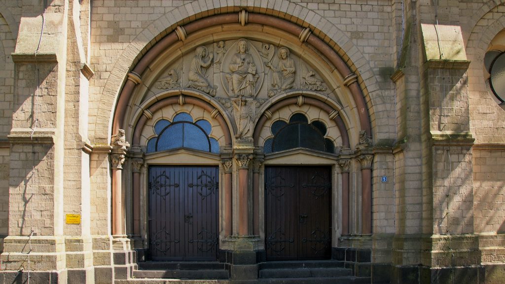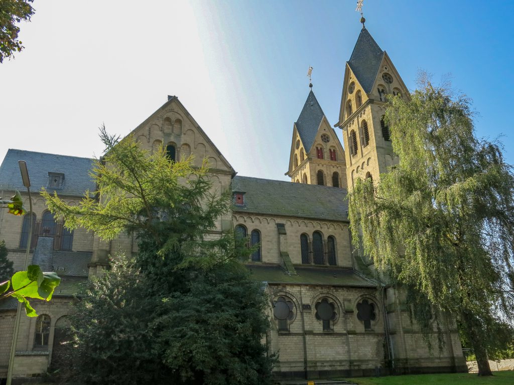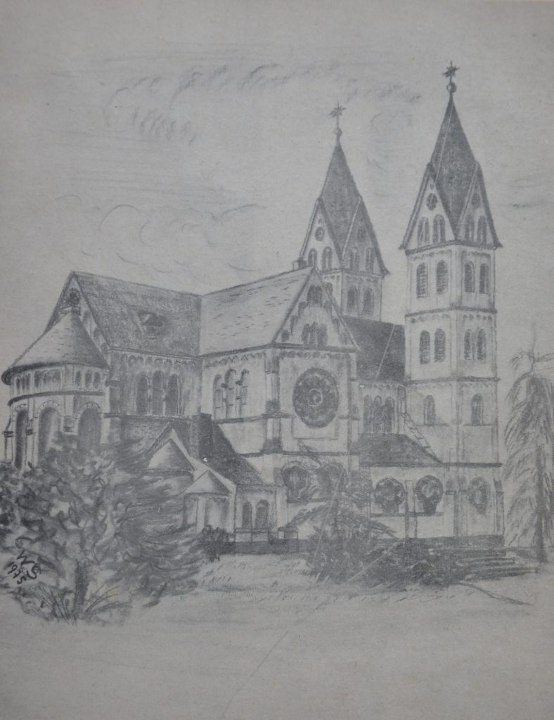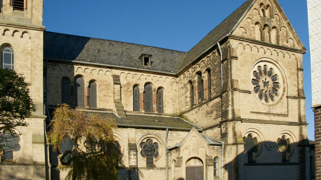Es handelte sich um eine „dreischiffige neuromanische Basilika mit Querhaus und halbrunder Apsis aus Ziegelstein, die, wie die beiden Türme der Doppelturmfassade, mit Webernem Tuffstein ummantelt war“8. Die Rhombendächer wurden mit Schiefer gedeckt. Das Mittelschiff hatte die Maße 14,92 x 6,97 m, die Seitenschiffe besaßen die gleiche Länge und eine Breite von 3,28 m. Das Querschiff war 7 m lang und 22,42 m breit9.