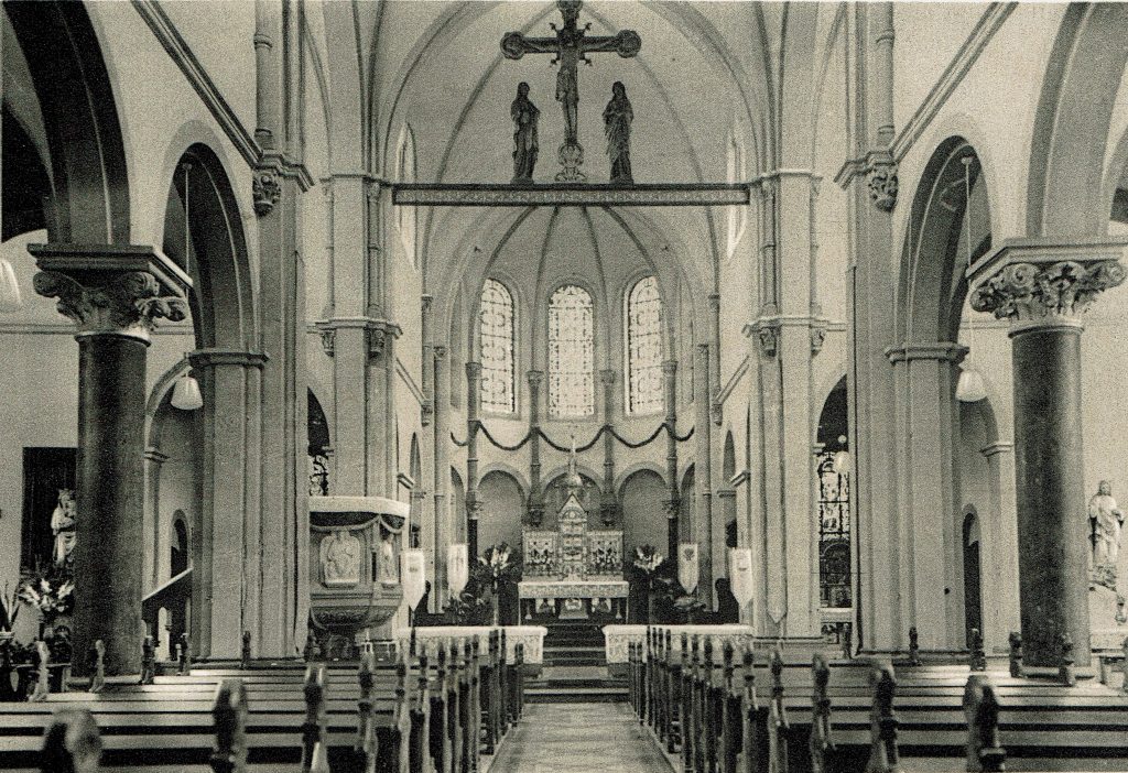 Der direkte Vorgängerbau war eine gotische Kirche im romanischen Stil. In den Fundamenten fand man den Abschlussstein aus dem Beginn des 18. Jahrhunderts. Dieser Bau war viel kleiner und endete hinter dem Chorbereich der letzten Kirche. Im gleichen Jahrhundert wurde das einschiffige Gebäude durch Seitenschiffe erweitert und mit einem neuen Chor versehen. Zusätzlich wurde noch eine kleine Kapelle angebaut, das so genannte „Pescher Chörchen“. Der Turm stand an der Westseite. Dieser Bau aus dem 16. Jahrhundert bestand aus Backsteinen.1 Er war vor dem Abriss im Jahre 1888 sowohl innen als auch außen mit Kalk geschlemmt.2