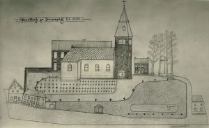 Sie bestand aus drei Schiffen, die eine Breite von 13,89 m und eine Länge von 11,15 m hatten. Das linke Seitenschiff und das Langschiff wurden mit einem Bohlenflachgewölbe geschlossen, das rechte Seitenschiff hatte ein Bogengewölbe. Daran schloss sich ein Chor an, der als halbes Achteck gestaltet und gewölbt war. Er besaß die Ausmaße von 6 x 6,28 m. An der Westseite erhob sich ein viereckiger Turm in barocken Formen.7 Mit allen Gewerken war die alte Kirche etwa 32 m lang und 19,60 m breit.