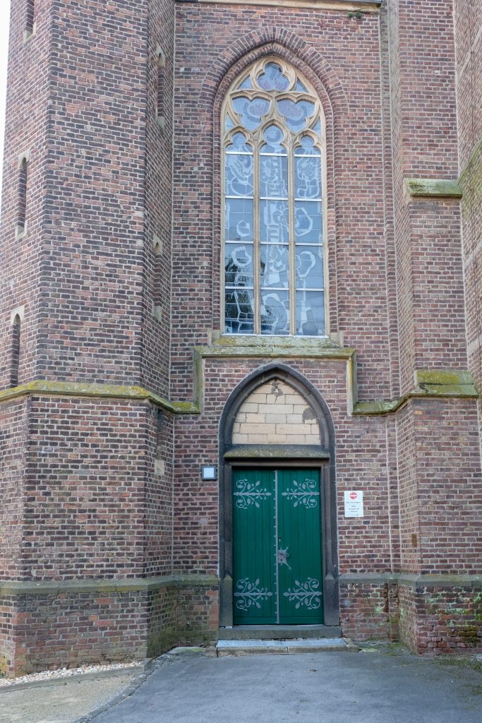Im westlichen Teil befinden sich zwei schlanke Türmchen, die die Aufgänge zur Orgelbühne enthalten. Der Hauptturm wurde nicht neu errichtet. Er stammt noch von der alten Kirche. Er hat eine achtseitig geschweifte Haube und einen abgesetzten spitzen Helm; über der Vierung ist ein achtseitiger Dachreiter und ein sechsseitiger Treppenturm an der Nordwestecke.4