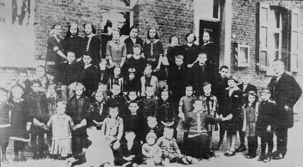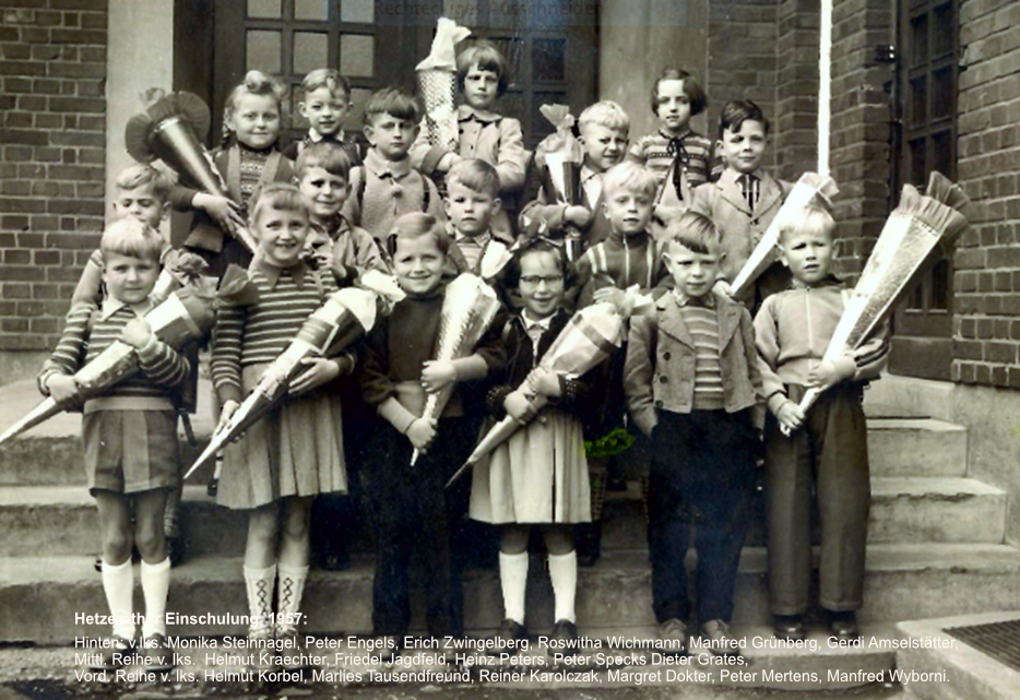 „Diesen Tag habe ich besonders in Erinnerung behalten. Ich war als einziger Junge der Schulneulinge von Lehrer Pelzer ausersehen, in der Schulbank neben einem Mädchen zu sitzen. Wie viele Kinder zu dieser Zeit von Lehrer Pelzer unterrichtet wurden, kann ich nicht sagen, aber es waren nicht wenige. Mitten im Klassenraum stand ein großer schwarzer Eisenofen, den der Lehrer in der kalten Jahreszeit schon morgens früh anzünden und versorgen musste. Eine von der Gemeinde beauftragte Frau hatte nicht nur für Sauberkeit zu sorgen, sie musste am Abend vorher den Ofen zündfertig vorbereiten. Während der Unterrichtszeit versorgten vom Lehrer beauftragte Jungen oder auch Mädchen der Oberstufe den Ofen. Steinkohle der Zeche Sophia-Jacoba diente als Heizmaterial. Die Kinder, die in der Nähe des Ofens saßen, konnten oft die Wärme kaum ertragen, und die in der Nähe der Fenster saßen hatten nicht selten kalte Hände und Füße. Die meisten Schülerinnen und Schüler kamen auf „Klompen“ (Holzschuhe) zur Schule. Lederschuhe gab es zwar damals auch schon, aber die waren den meisten Eltern einfach zu teuer. Lederschuhe waren den Sonntagen vorbehalten. In Hetzerath wohnten damals auch einige „Klompemäker“ (Holzschuhmacher), die aus Pappelholz die Klompen fertigten. Im Schulgebäude wurden die Klompen ausgezogen und im Schulflur an der Wand entlang wohlgeordnet abgestellt. Die Kinder trugen dann über ihren Strümpfen aus Stoff gefertigte „Schlüppchen“ (Hausschuhe), die von den Müttern meist selbst genäht wurden.“5