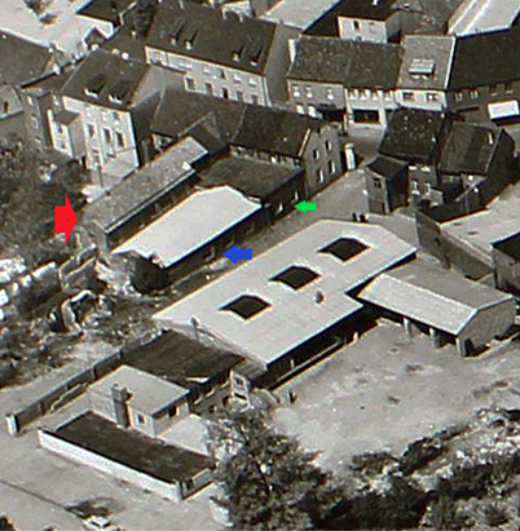Der dritte Bau (blau) weist ein neues Dach auf, er ist erst nach dem Krieg errichtet worden. Vermutlich lag hier früher ein weiterer Saal, der im Krieg zerstört worden ist. Hier haben die Archäologen einen zugeschütteten Granattrichter gefunden. Dieser Anbau war ab den 1960er Jahren vermietet, zunächst an die Kleiderfabrik G. Dürselen aus Otzenrath, die hier als Zweigbetrieb eine Näherei errichtete, ab 1973/74 bis 1984 an die Eisenwarenhandlung Zimmer & Söhne und schließlich an eine Spielothek. Erst Hedi Bouaziz nutzte später die Räume wieder gastronomisch.