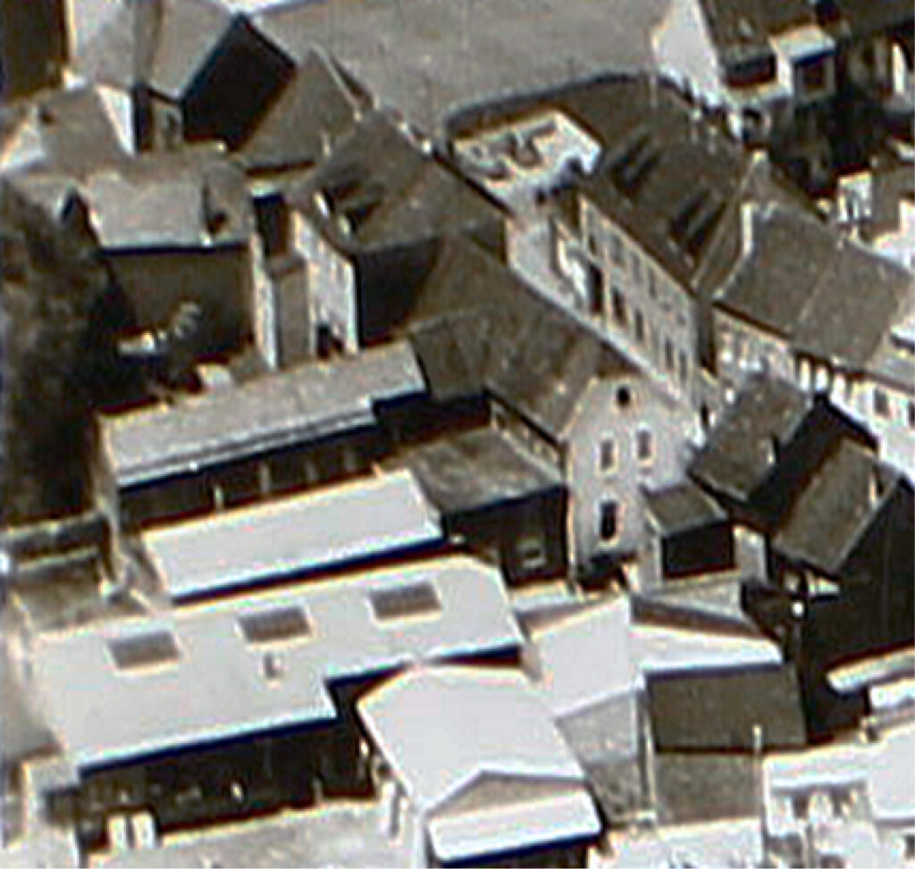 Eine Luftaufnahme aus den 1950er Jahren zeigt Folgendes: Noch ist die Kirchstraße nicht bis zur Südpromenade verlängert worden, dies geschah erst 1959. Hinter dem Hauptgebäude sind drei Anbauten zu erkennen. Zwei der Gebäude stammten noch aus der Vorkriegszeit, deren Baujahr ist nicht überliefert. Im langestreckten Gebäude (rot) befanden sich auf der ersten Etage die Hotelzimmer (vier Einzelzimmer und ein Doppelzimmer), im Erdgeschoss das Büro, die Küche und ein Kühlraum, unter dem Anbau befand sich ein Gewölbekeller. Im rechteckigen Anbau (grün) war ein Saal der Gastwirtschaft, genannt „das Sälchen“.