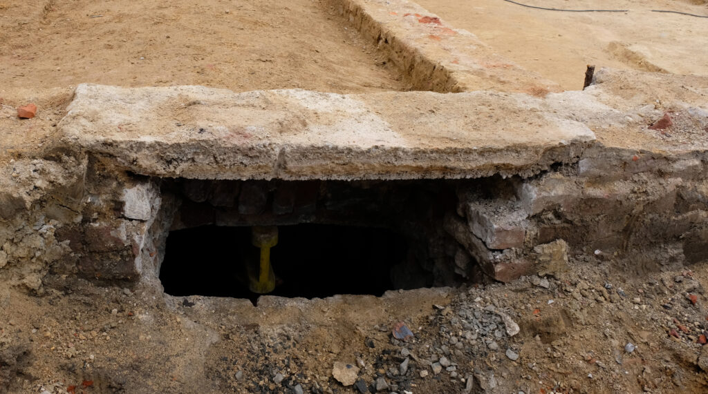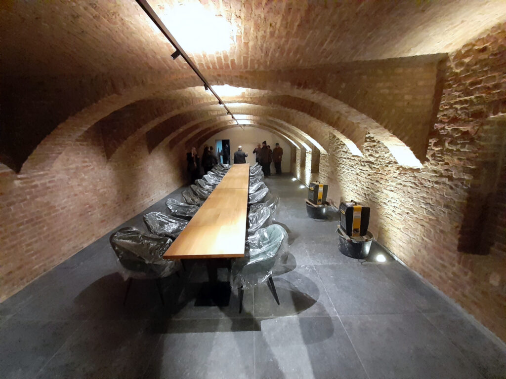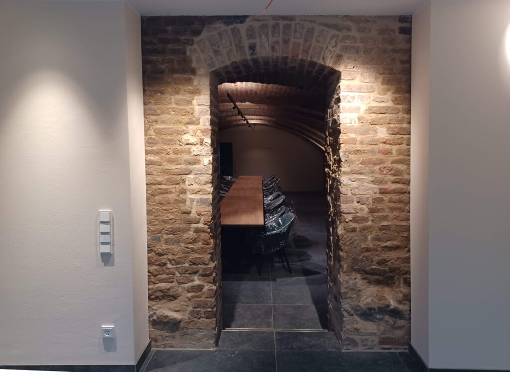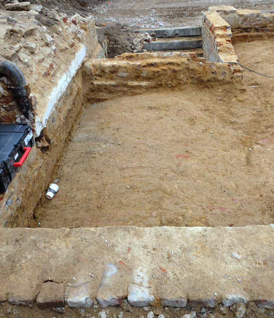 Hinter dem Hauptgebäude, parallel zum Anbau, liegt ein langgestreckter Gewölbekeller aus Feldbrandziegeln; da er erhalten bleiben sollte, wurde er von der archäologischen Untersuchung ausgespart. Er wurde von der Baufirma freigelegt und nur das Bodenmaterial über seiner Decke händisch entfernt und diese anschließend mit einer Schutzplane abgedeckt.