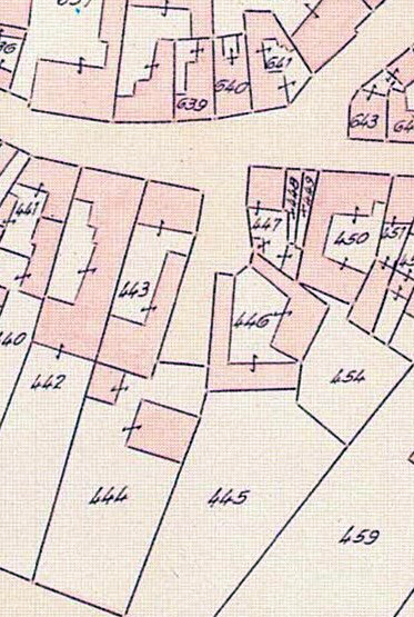 Auf dem Ausschnitt der Flurkarte erkennt man die damalige Situation. Rechts der Gaststätte führte ein Weg zu einem zurückliegenden Haus, das bis Anfang des 20. Jahrhunderts als Pastorat diente, später als Wohnhaus zum Gymnasium gehörte. Im Krieg zerstört und nicht wiederaufgebaut, entstand hier 1959 eine durchgehende Straße hin zur Südpromenade.