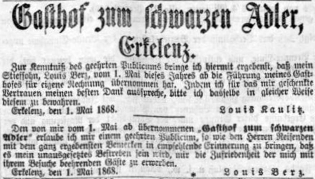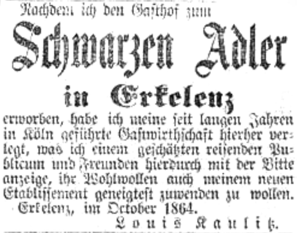 1864 verkaufte Louis Kaulitz die Gaststätte „Drei Könige“ und das „Hotel Victoria“, das auch am Thurnmarkt lag, und kaufte in Erkelenz den „Schwarzen Adler“.