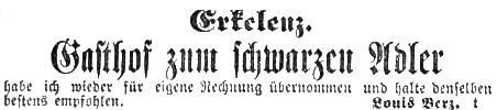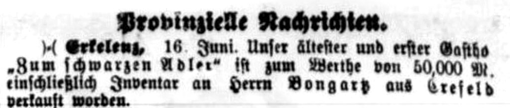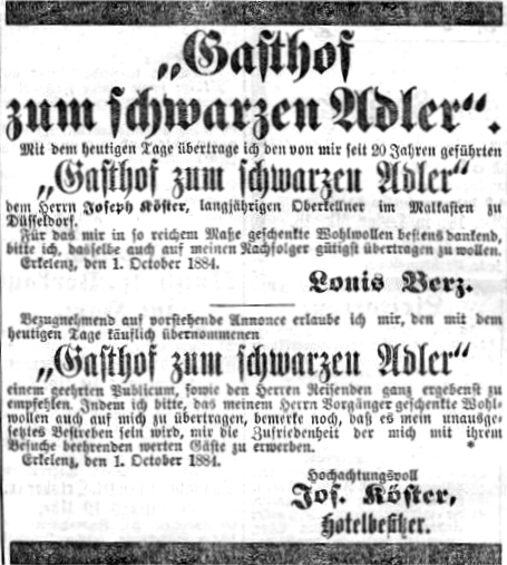 Oktober 1884 wurde der Gasthof an Joseph Köster übergeben, der in Düsseldorf langjähriger Oberkellner im „Malkasten“ gewesen war. Vermutlich hatte aber noch kein Verkauf stattgefunden, denn schon Ende Dezember übernimmt wieder Louis Berz den „Schwarzen Adler“. Gleichzeitig blieb er aber weiterhin Wirt der Düsseldorfer „Tonhalle“.