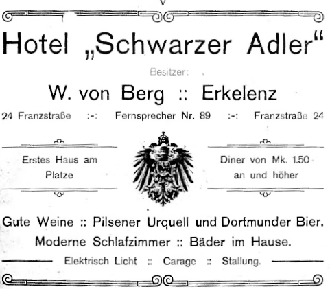 1896, also noch im gleichen Jahr, wurde als Betreiber des Hotels ein W. von Berg genannt.8 Ob von Berg zunächst nur Pächter des Adlers gewesen war? W. ist ein Kürzel für Wilhelm. Wilhelm von Berg wurde am 28. Dezember 1873 in Erkelenz geboren und starb am 14. Juli 1921 in Erkelenz. Er heiratete am 28. Januar 1902 in Gerderath Maria Luzia Wefers, diese war am 18. September 1873 in Mönchengladbach-Waldhausen geboren und starb am 5. Juli 1957 Erkelenz. Ein Bruder von Wilhelm betrieb eine Gastwirtschaft in Baal.9