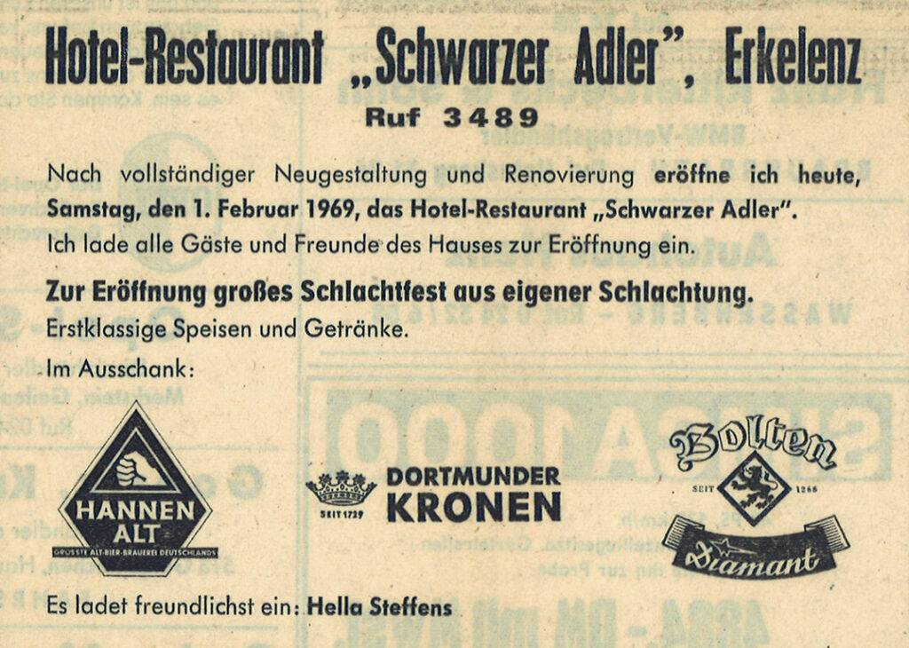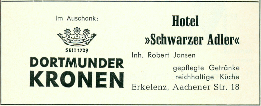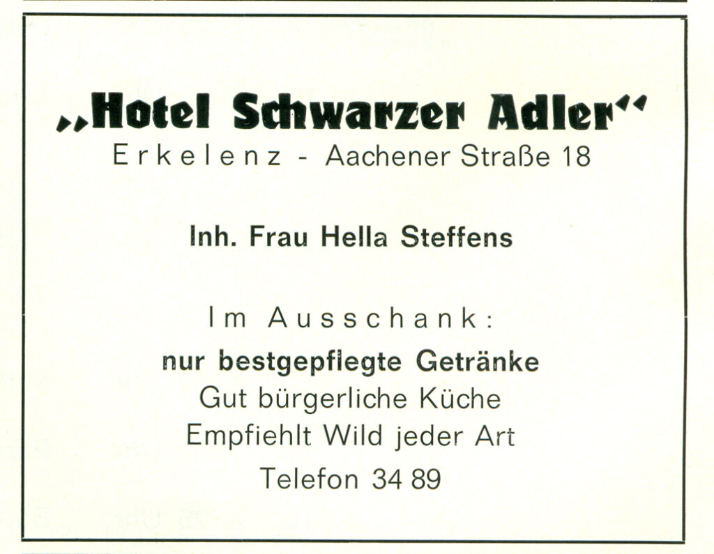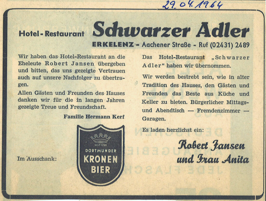 Am 29. April 1964 wurde „Hotel Restaurant Schwarzer Adler“ von Familie Kerf an Robert und Anita Jansen verpachtet.11
