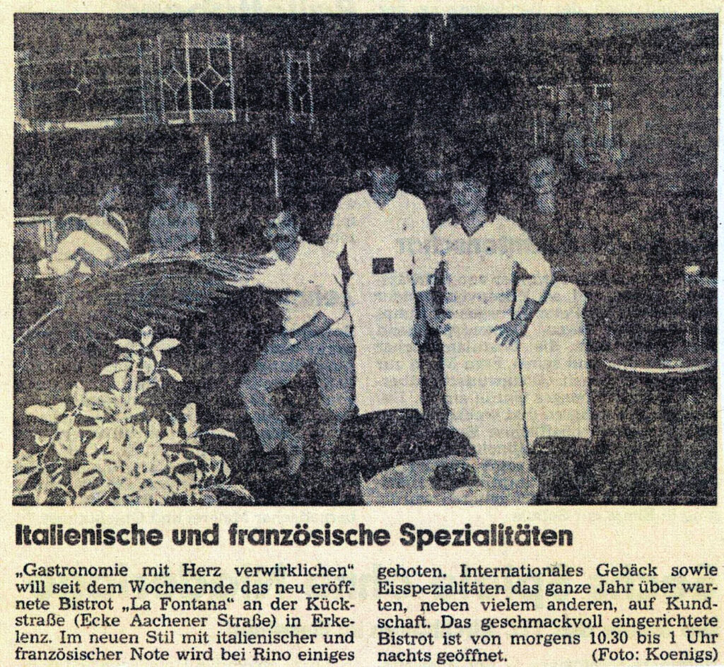 Das Zeitungsbild zeigt die Eröffnung des Speiserestaurants Hedi’s. Bürgermeister Erwin Mathissen (rechts) und der erste Beigeordnete Dr. Hans-Heiner Gotzen (3. von rechts) gratulieren.