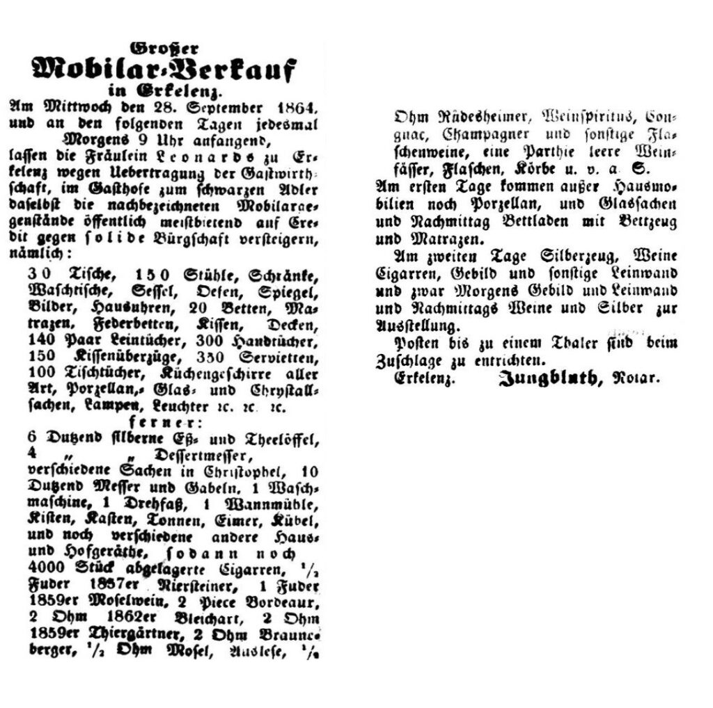 Seine Tochter verkaufte 1864 die Gaststätte und ließ das Mobiliar öffentlich im Gasthof an zwei Tagen versteigern. In einer Zeitungsanzeige wurden die Haus- und Hofgeräte genau aufgeführt. Der heutige Leser erkennt so den ungefähren Umfang des Betriebes.