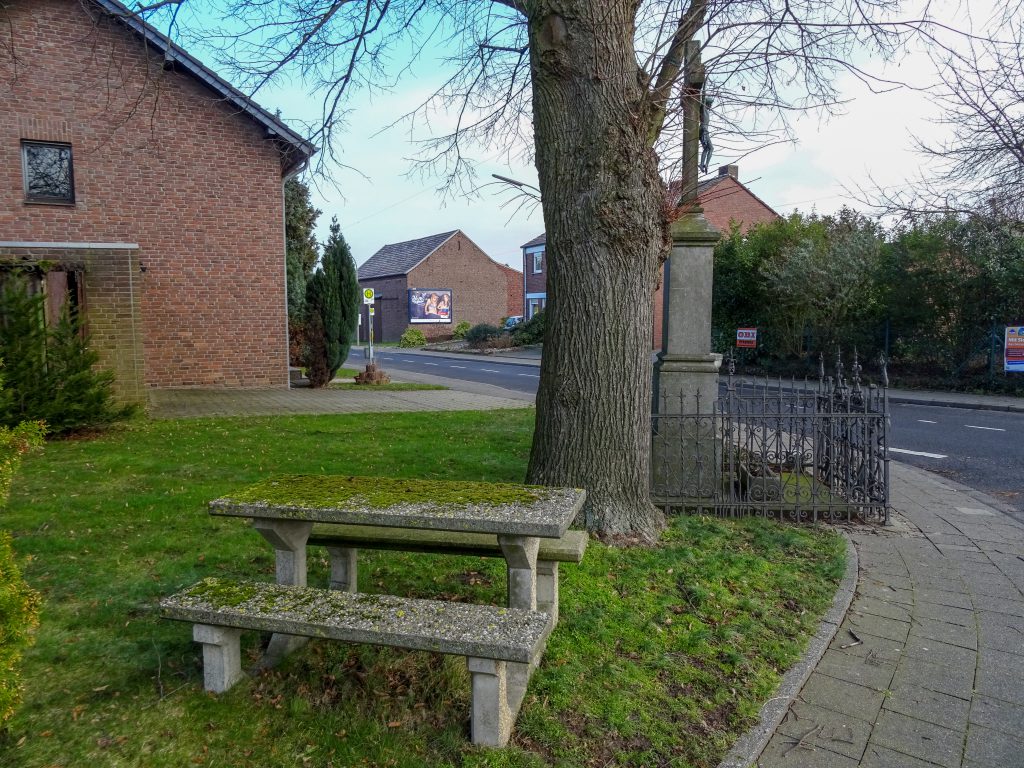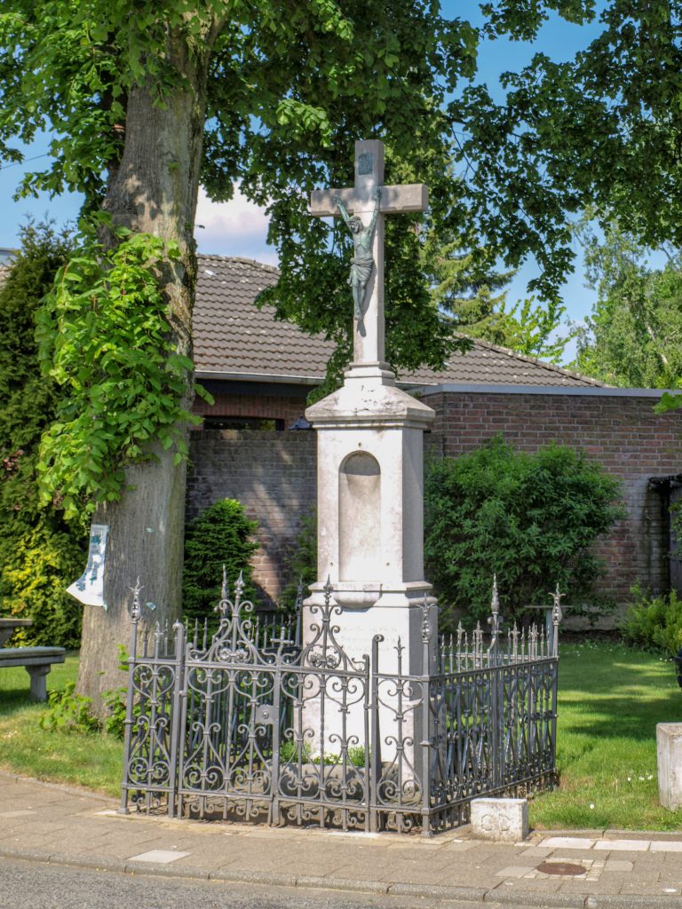 Im Jahr 1849 errichteten die Witwe Wilhelm Klein, Heinrich Boß und der Pfarrer Clemens Joseph Holzapfel an dieser Stelle, früher genannt „An der Schießruthe“, ein aus Königswinterstein gefertigtes Kreuz, das am 20. September 1852 vom damaligen Landdechanten Bono aus Holzweiler eingeweiht wurde. Dieses Kreuz „An der Schießruthe“ wurde am 12. Juli 1908 vom Blitz getroffen und zertrümmert, nachdem früher schon einmal der Blitz dort eingeschlagen hatte. Dieses Naturereignis schrieb man den das Kreuz umgebenden Fichten- und Tannenbäumchen zu, die deshalb entfernt wurden. Die Geschwister Heinrich und Anna Maria Schmitz ließen durch den Steinhauer Sperber aus Mönchengladbach ein neues Kreuz aus belgischem Granit anfertigen und aufstellen, das am 25. März 1909 eingesegnet wurde. Es kostete ohne das das Kreuz umgebende Gitter, das auch von den Geschwistern Schmitz geschenkt wurde, damals 512 Mark. Das Kreuz, das heute noch von der Nachbarschaft gepflegt wird, hat frontal folgende Beschriftung: