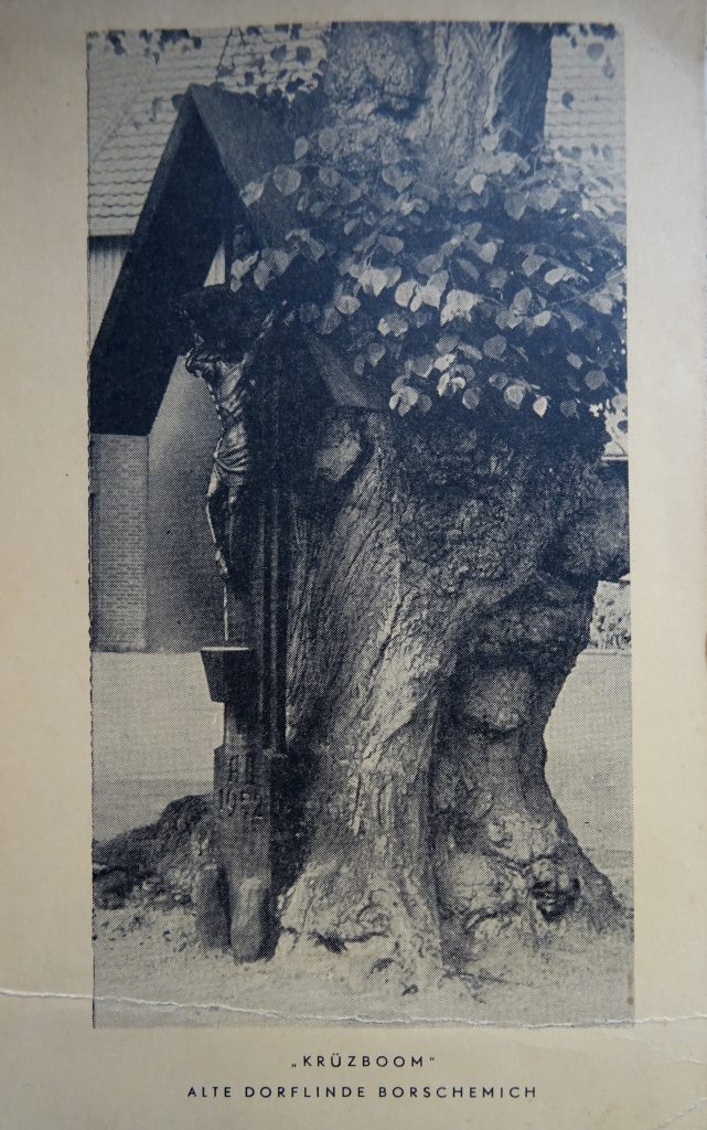 Jeder in Borschemich kennt die alte Linde des Dorfes, die im alten Dorf am Kreuzungspunkt der Straßen Linde Borschemich – Marienstiftsstraße – Immerather Straße stand. Sie begrüßte die Bewohner und Besucher mitten im Ort, wenn man von Keyenberg oder Immerath kam. Unter ihrer Krone stand ein Wegekreuz. Das 3,10 m hohe neuzeitliche Kreuz wurde von einem Satteldach mit Kupferblech bedeckt. Es enthält die Inschrift „AD 1952“.