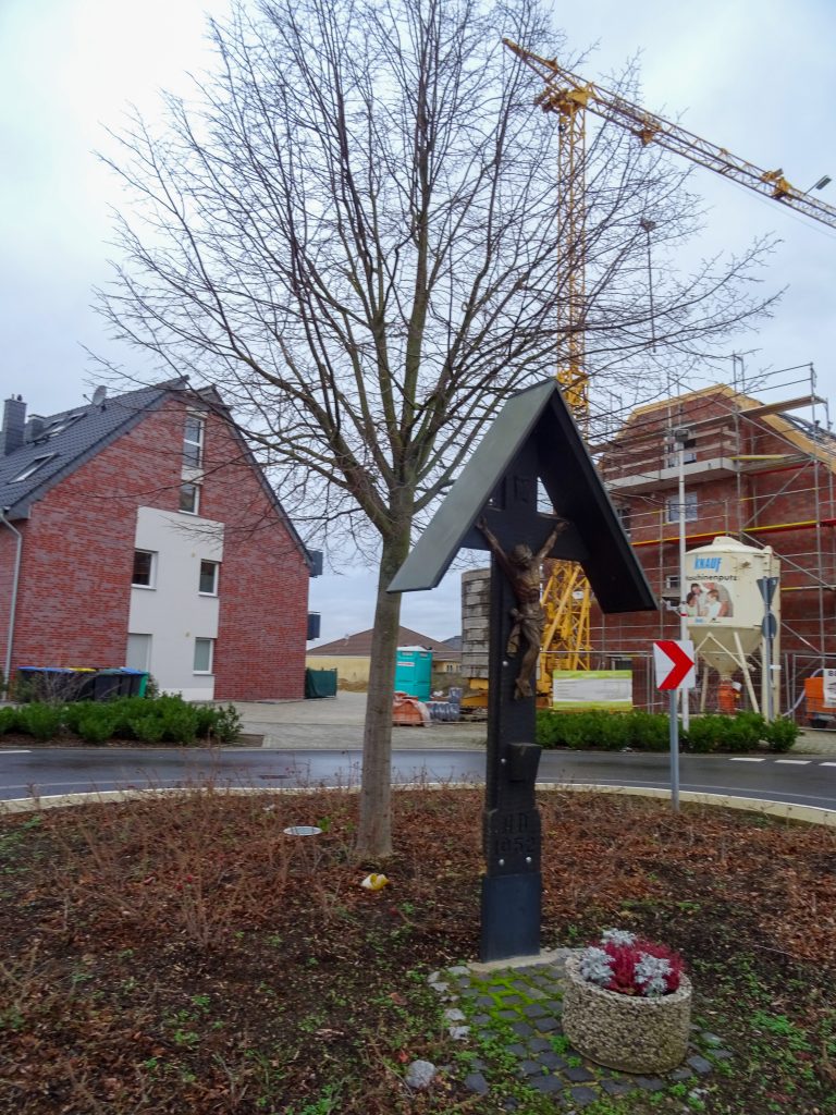 Von 1902 bis 1938 stand an dieser Stelle ein 3,50 m hohes Steinkreuz. Während des Nationalsozialismus wurde es als Verkehrshindernis entfernt und an einer gegenüber liegenden Hauswand wieder errichtet. „Nach einem erneuten Standortwechsel war es schließlich abbruchreif.“5