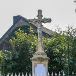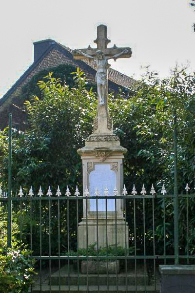 Das Wegekreuz stand im alten Borschemich auf 4 Stufen und war von einem schmiedeeisernen Gitter umgeben. Im neuen Ort fällt die Umfriedung weg, aus den vier Stufen wurden zwei.