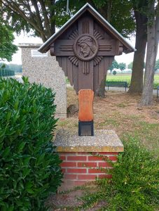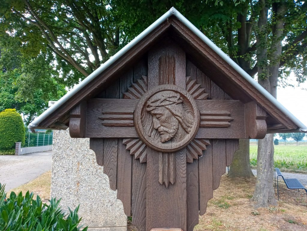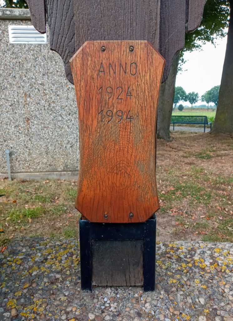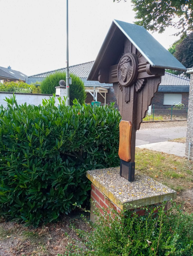 Das Kreuz hat eine Höhe von 1,60 m und besteht aus Holz. Es wird durch ein Satteldach aus Blech geschützt. Ein Christuskopf befindet sich als Relief auf dem Balkenkreuz, das durch Sonnenstrahlen eingerahmt wird. Das Kreuz steht auf einem gemauerten Sockel. Die Inschrift lautet:
