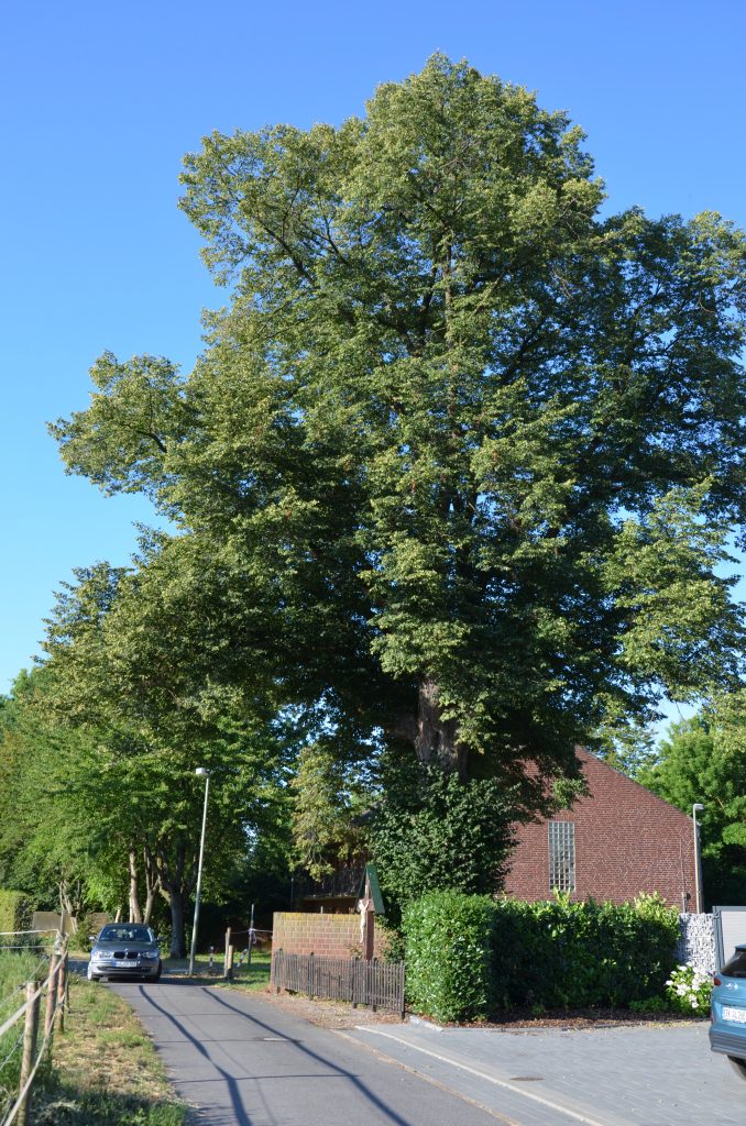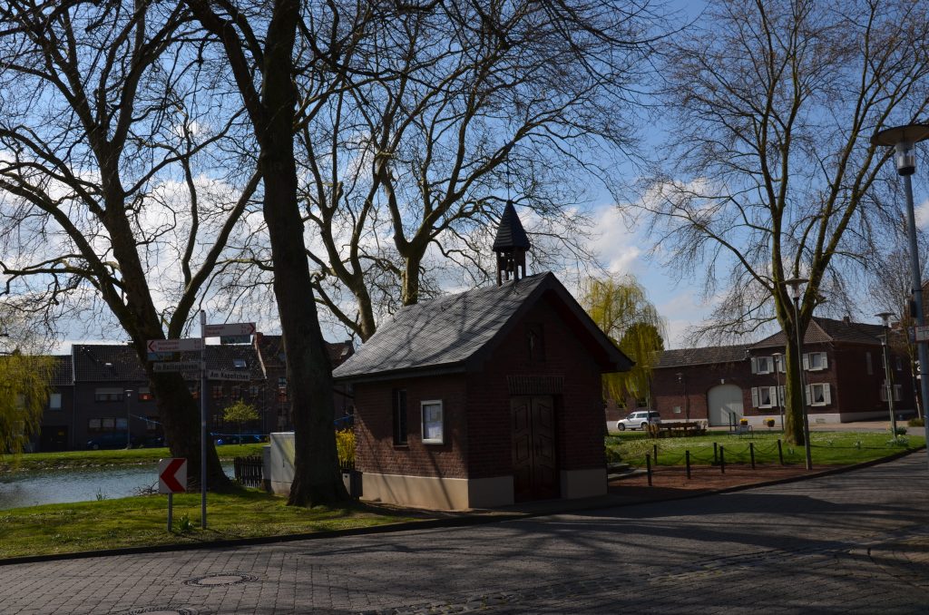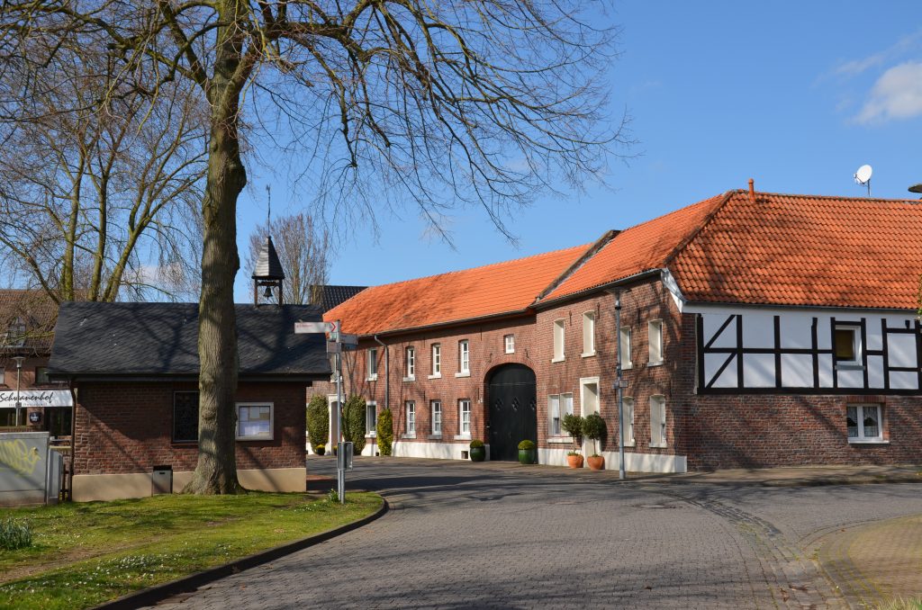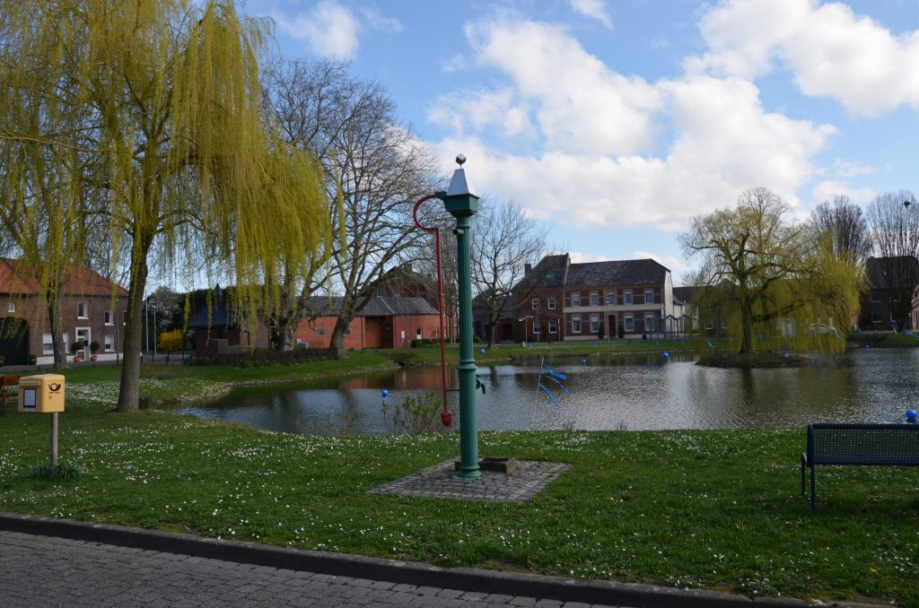 Eine historische Wasserpumpe erinnert an die Zeit vor Einführung der Wasserleitung und ein Mispelbaum mit der Geldernschen Rose, an das 700-Jahr-Jubiläum des Dorfes.