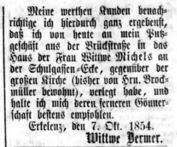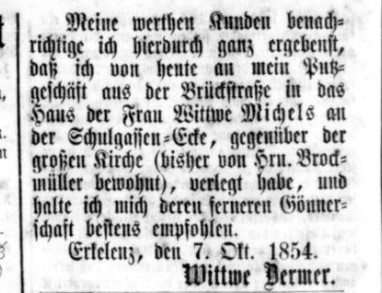 Diese Anzeige im Erkelenzer Kreisblatt aus dem Jahre 1854 zeigt, dass an der heutigen Ecke Schülergasse-Kirchstraße um diese Zeit bereits ein Geschäft vorhanden war.