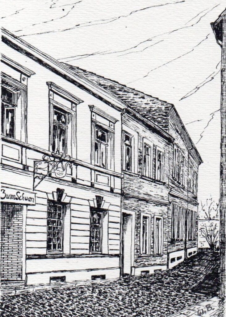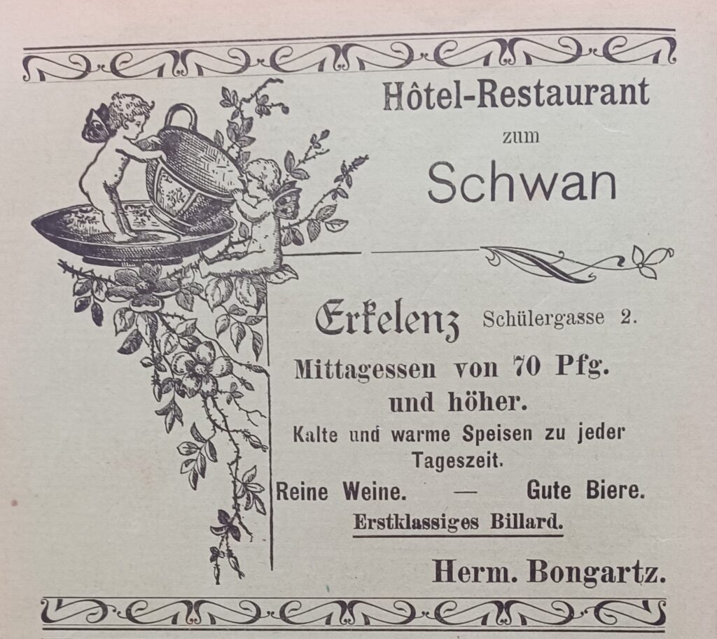 Seit 1903 führte Heinrich Bongartz in der Schülergasse das Hotel-Restaurant „Zum Schwan“. Der Schwan war in Erkelenz ein beliebter Treffpunkt, auch für Vereine, da es einen kleinen Saal gab. Besonders zu den Kirmes- und Karnevalstagen herrschte Hochbetrieb.