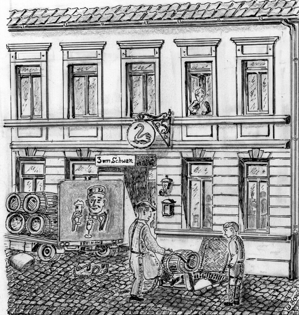 Dazu schreibt Wilhelm Borgs am 26.04.2023 in der Rheinischen Post: „Gerade vor den „Hochtagen“ brauchte der Schwan immer wieder frisches Bier, also kam häufiger das Bierauto. Stand der Lastwagen vor dem Schwan, flog ein dickes Lederkissen auf das Pflaster. Darauf ließ der Fahrer ein schweres Bierfass fallen und rollte es dann zum Kellerloch“