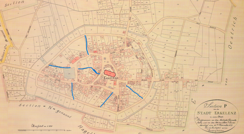 Neben den vier Straßen, die zu den Stadttoren führten, gab es im mittelalterlichen Erkelenz mehrere Gassen, die zur Stadtmauer führten. Sie wurden eindeutig aus wehrtechnischen Gründen geschaffen. Durch diese konnte die Stadtmauer aus der Stadtmitte schnell erreicht werden. Diese Gassen sind heute noch erhalten.