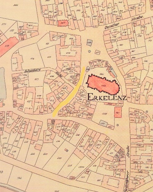 An dieser kurzen Straße gab es früher eine ganze Reihe wichtiger Geschäfte, z.B. die Schwarz’sche Apotheke, Ecke Schülergasse, die schon 1805 belegt ist. Im Jahre 1874 eröffnete Heinrich Fongern die Tonhalle (heute großes Wohnhaus neben der Gaststätte). Diese Wirtschaft war für das Erkelenzer Vereinsleben von besonderer Bedeutung. Als Fongern 1886 auch den „Schwarzen Adler“ übernahm, hatte er das völlige Saalmonopol in Erkelenz. Er legte den Saal in der Kirchstraße still. Darauf erwarb der Kaplan und Religionslehrer Dr. Esser den Fongernschen Saal für den von ihm gegründeten Kirchenchor „Pfarr-Cäcilien·Verein“. Nach Essers Versetzung kaufte Anton Raky 1897 den Saal, den dann der Gastwirt Michael Eggerath (vorher Lindenhof an der Straße nach Kückhoven) übernahm. Aus dem Cäciliensaal wurde der Kaiser-Saal. Unter diesem Namen bestand er bis zur Zerstörung der Stadt im Januar/Februar 1945, danach war lange Zeit das Grundstück unbebaut (Garagen und Parkplatz Hotel „Schwan“).