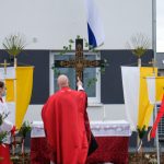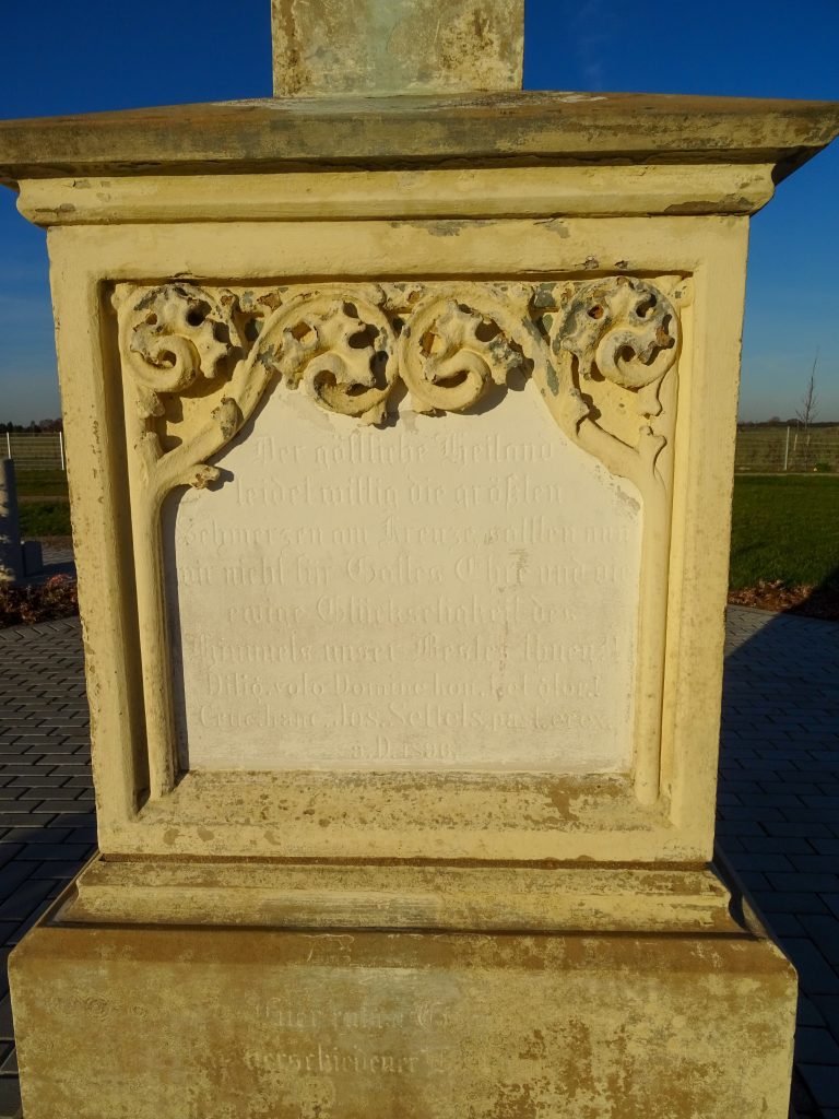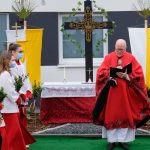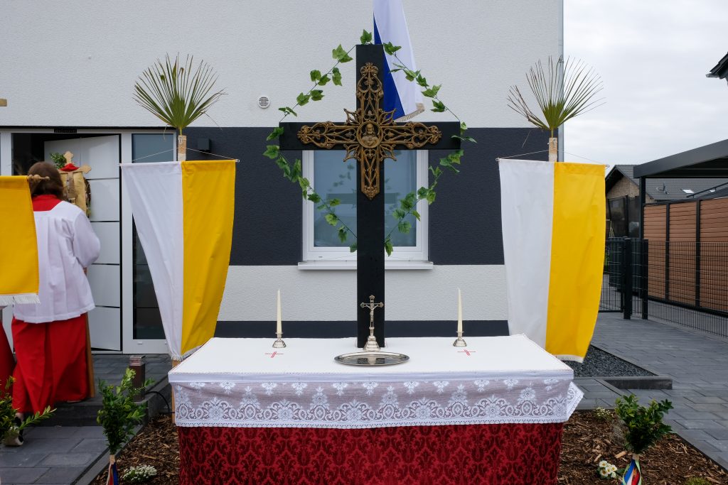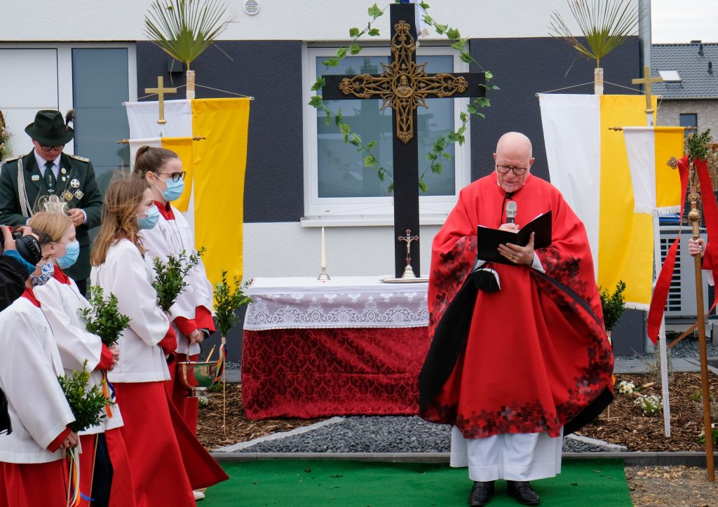 Nach dieser Zeremonie zog die Gemeinde zu einem Straßenkreuz, das der Schützenbrudermeister der Sankt Sebastianus Schützenbruderschaft Keyenberg, Alexander Tetzlaff, vor seinem Haus errichtet hatte, um der Segnung dieses neuen Wegekreuzes beizuwohnen.