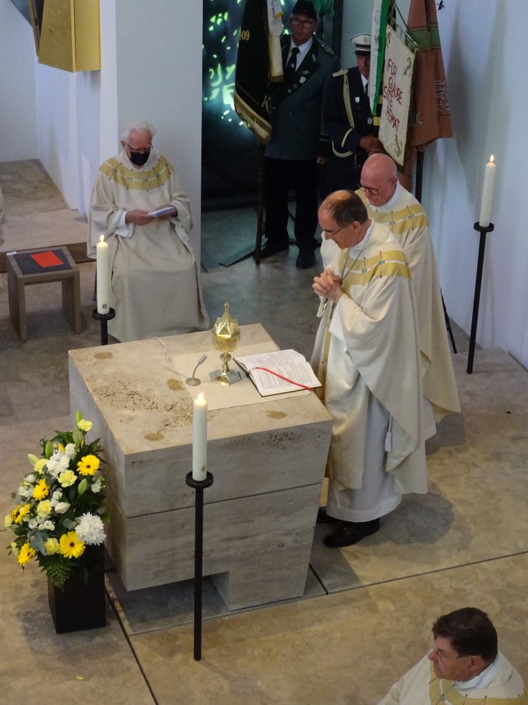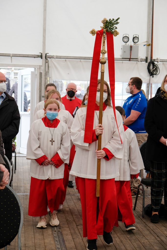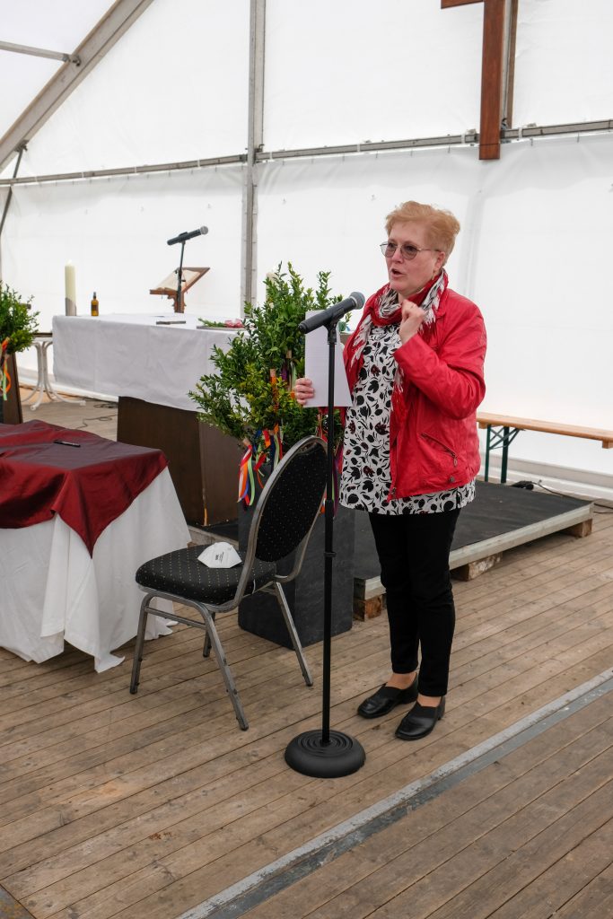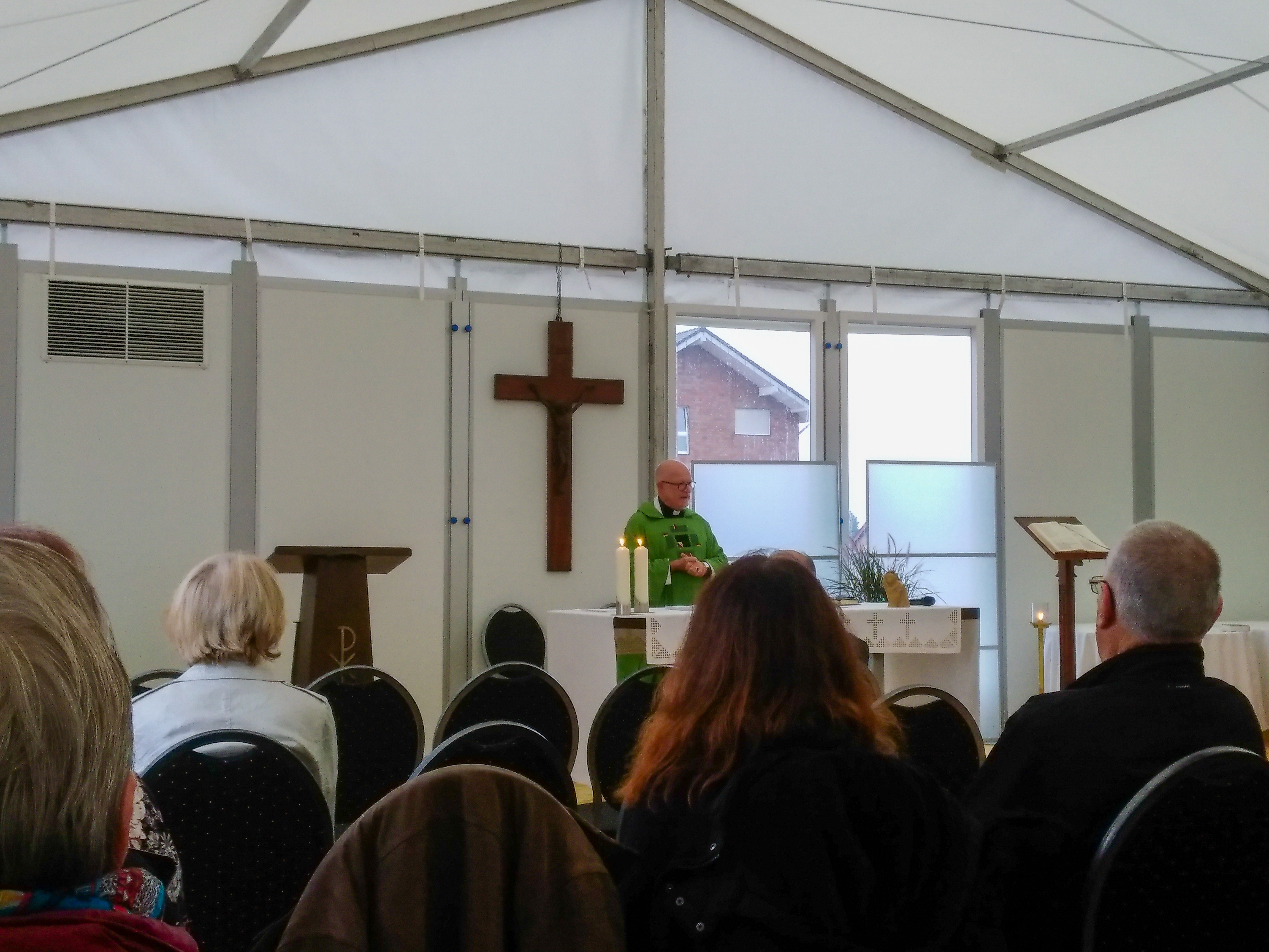 Der Kirchenvorstand der Pfarrgemeinde Christkönig hatte auf Anregung des Kapellenvorstandes der Umsiedlungsorte beschlossen, im Veranstaltungszelt der neuen Gemeinden alle 2 Monate einen Gottesdienst abzuhalten, weil immer mehr Mitbürger bereits in den neuen Ort umgezogen sind. Am 20.10.2019 war Gottesdienstpremiere. Pfarrer Rombach hielt im gut beheizten und gefüllten Festzelt die 1. Heilige Messe unter dem Motto „Vertrauen und Heimat“. Symbolisch für dieses Motto hatte er die Figur von Dorothea Steigerwald „Bleib sein Kind“ und einen neuen Singspruch „Bei Gott bin ich geborgen“ mitgebracht.