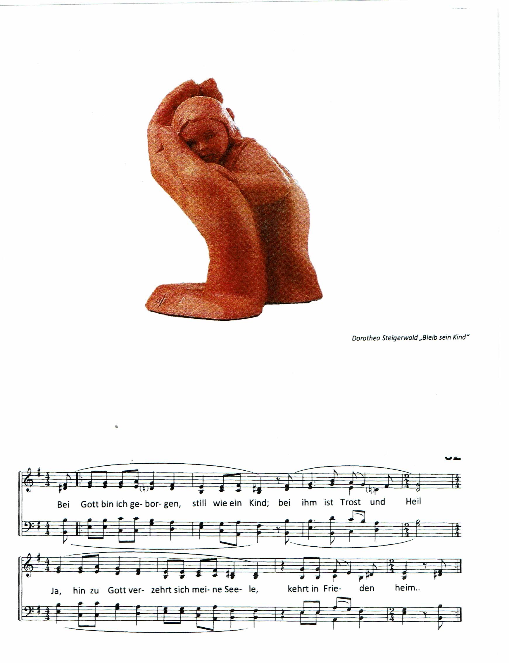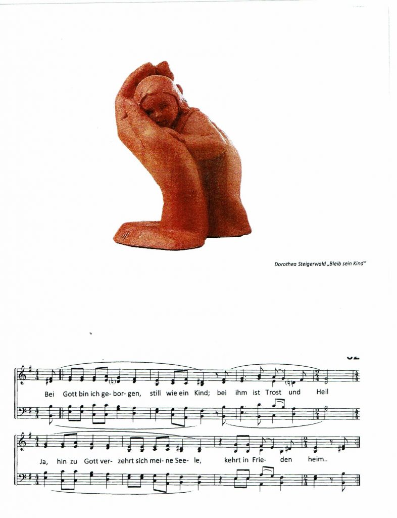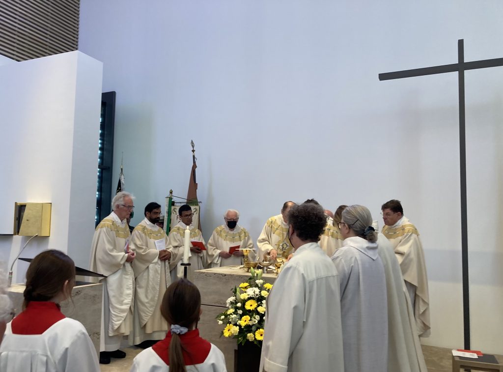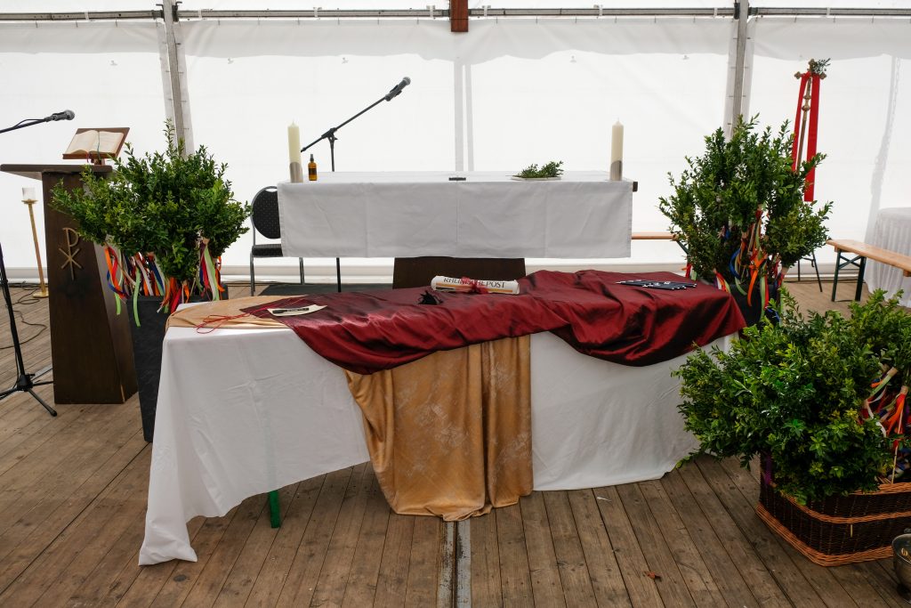 Der Kirchenvorstand der Pfarrgemeinde Christkönig hatte auf Anregung des Kapellenvorstandes der Umsiedlungsorte beschlossen, im Veranstaltungszelt der neuen Gemeinden alle 2 Monate einen Gottesdienst abzuhalten, weil immer mehr Mitbürger bereits in den neuen Ort umgezogen sind. Am 20.10.2019 war Gottesdienstpremiere. Pfarrer Rombach hielt im gut beheizten und gefüllten Festzelt die 1. Heilige Messe unter dem Motto „Vertrauen und Heimat“. Symbolisch für dieses Motto hatte er die Figur von Dorothea Steigerwald „Bleib sein Kind“ und einen neuen Singspruch „Bei Gott bin ich geborgen“ mitgebracht.