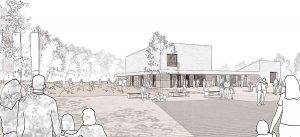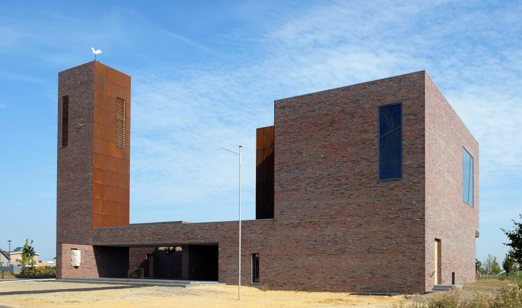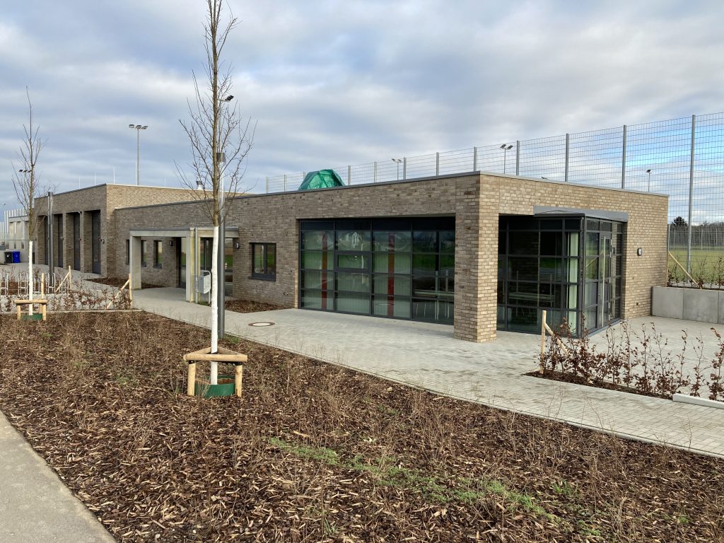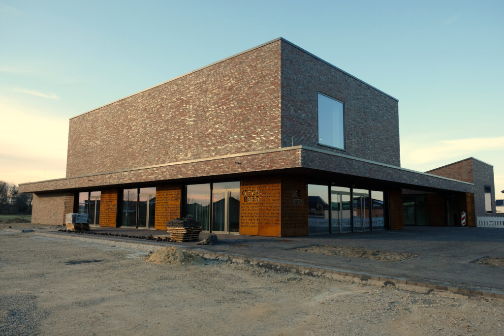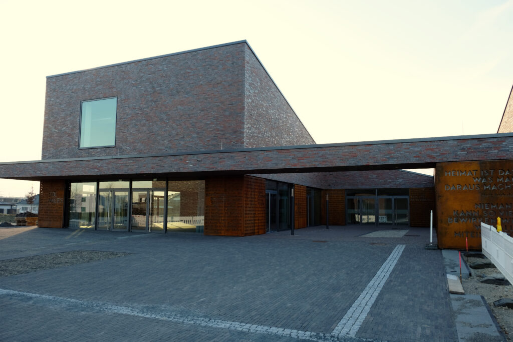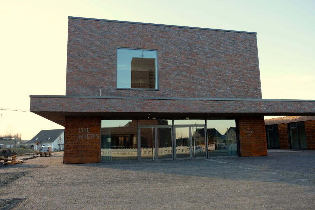 Eigentlich sollte die Mehrzweckhalle für die Umsiedlungsorte längst ihrem Bestimmungszweck übergeben worden sein. Doch Probleme in der Materialbeschaffung und bei den Handwerkern verschoben die Fertigstellung um fast ein Jahr. Dem Architekten Thomas Duda aus Bergisch Gladbach, der 2019 den ausgeschriebenen Wettbewerb gewann, ist es gelungen, im Verbund mit der gegenüberliegenden Sankt-Petruskapelle eine Einheit an diesem Platz zu schaffen. Der technische Beigeordnete der Stadt Erkelenz sagte bei der Einweihung: „Das Gebäude nimmt sich zurück und ermöglicht in Kombination mit der Kapelle einen richtigen Dorfplatz.“1 Pfarrer Werner Rombach und Günther Jendges segneten das Gebäude ein.